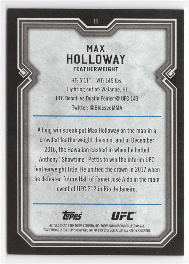 | Description: | Max Holloway | | Category: | MMA | | Year: | 2017 | | Product: | Topps Museum | | Card Number: | 11 | | Dimensions: | 3½" x 2½" |