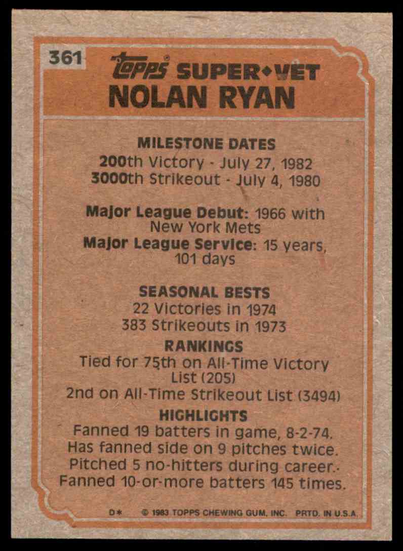 | Description: | Nolan Ryan | | Category: | Baseball | | Year: | 1983 | | Product: | Topps | | Team: | Houston Astros | | Card Number: | 361 | | Dimensions: | 3½" x 2½" |