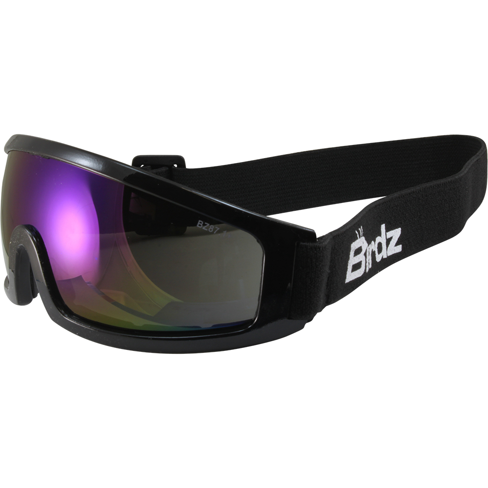 Sleek, simple, and low-profile, our Birdz Eyewear Robin Motorcycle Safety Goggles keep your eyes protected from wind and debris no matter what adventures you get up to. Whether you are riding your motorcycle on the open road, catching air on the slopes as you ski or snowboard, or even riding the wind during skydiving, these shatterproof polycarbonate safety lenses encased in a durable black polycarbonate frame keep your eyes free of dangerous debris. Featuring anti-fog coating for clear, unencumbered vision in all conditions plus scratch-resistant coating to protect your lenses from daily wear and tear, the Robin goggles are lined with top-quality EVA foam padding for exceptional comfort and just the right amount of indirect air movement and boast a comfortable, adjustable elastic strap for a secure, long-lasting fit. All lenses incorporate UV400 filters to eliminate the harmful rays of the sun. Robin goggles are designed to accommodate a comfortable fit for larger faces and come complete with a Birdz microfiber pouch for cleaning and safe storage. This particular pair of goggles features attention-grabbing and colorful blue ReflecTech lenses, which reduce glare, reflect back a different shade at every angle, and keep your eyes out of view while enhancing contours and definition. Definitely not for the wallflowers among us!