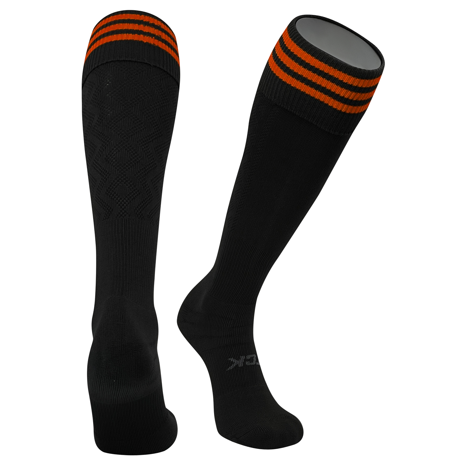 Striped pattern knee high socks for Soccer. Made in the USA.
