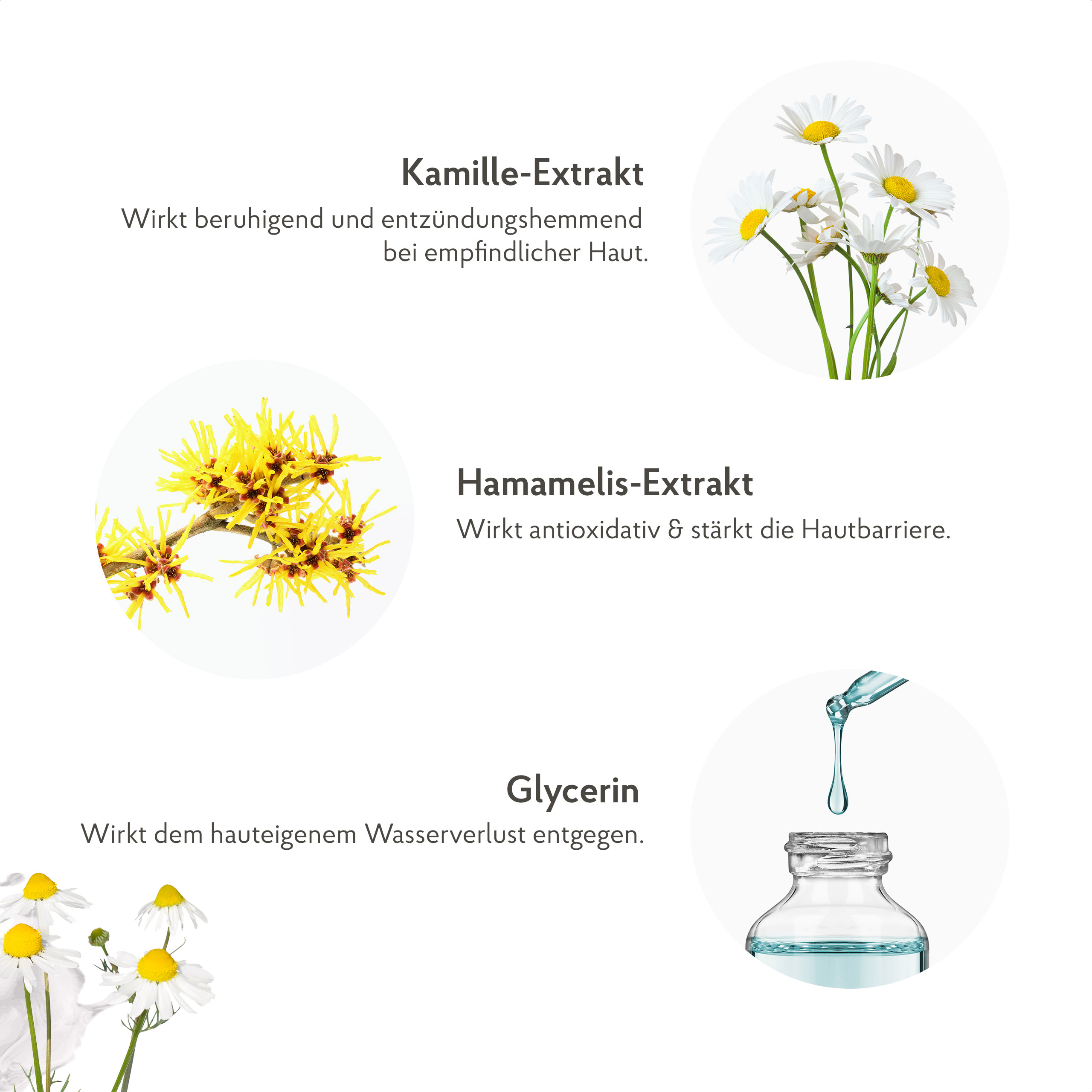Optimale Feuchtigkeitscreme bei trockener, rissiger und strapazierter Haut. Die entzündungshemmenden und antiseptischen Eigenschaften von ätherischen Ölen der Kamille pflegen trockene Hände intensiv und die Haut wird durch die Eigenschaften des Glycerins optimal mit Feuchtigkeit versorgt. Durch das Extrakt der Hamamelis (Zaubernuss) entsteht eine wundheilungsfördernde Wirkung und gereizte Haut wird beruhigt.