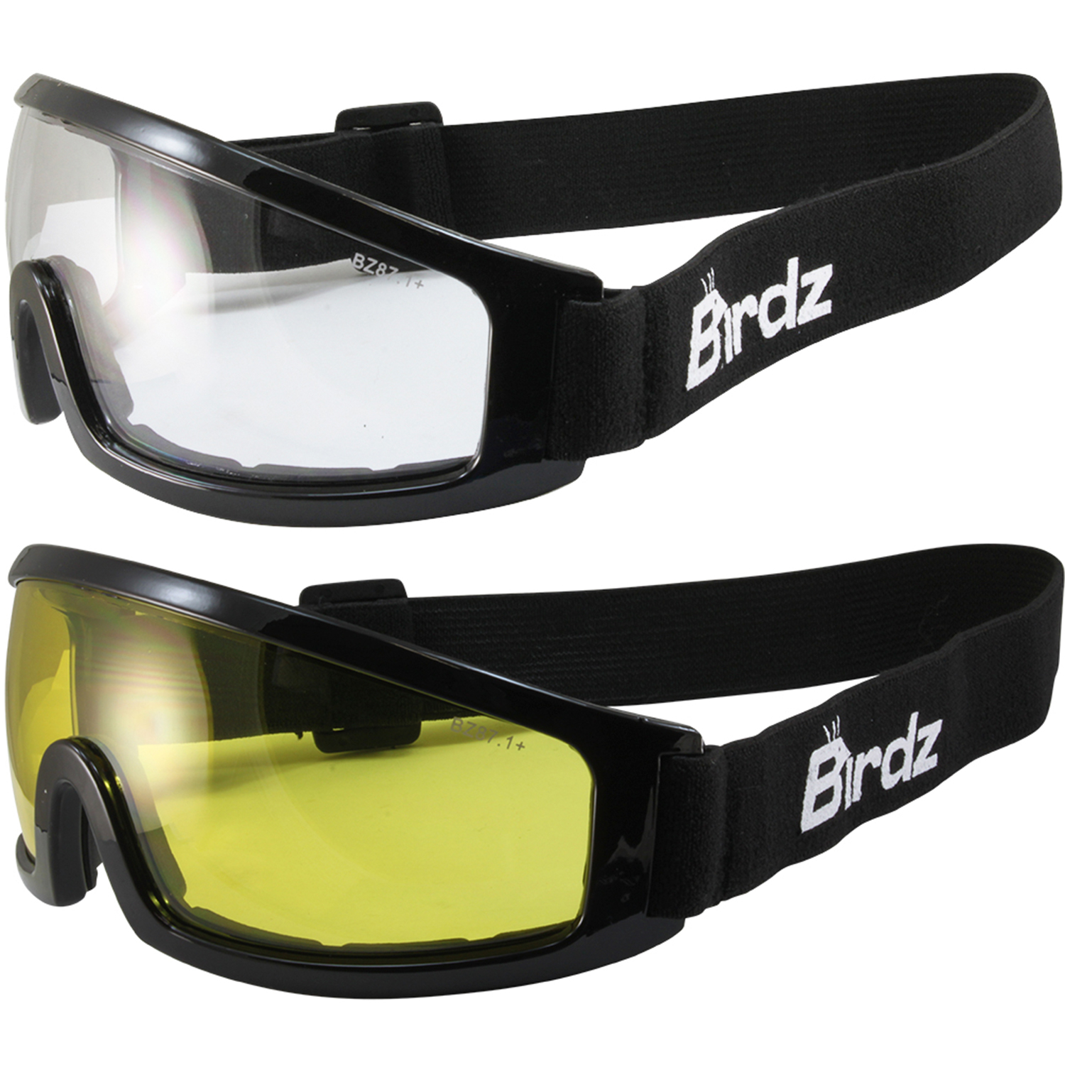 Sleek, simple, and low-profile, our Birdz Eyewear Robin Motorcycle Safety Goggles keep your eyes protected from wind and debris no matter what adventures youre up to. Whether you are riding your motorcycle on the open road, catching air on the slopes as you ski or snowboard, or even riding the wind during skydiving, these shatterproof polycarbonate safety lenses encased in a durable black polycarbonate frame keep your eyes free of dangerous debris. Featuring anti-fog coating for clear, unencumbered vision in all conditions plus scratch-resistant coating to protect your lenses from daily wear and tear, the Robin parachute goggles are lined with top-quality EVA foam padding for exceptional comfort and just the right amount of indirect air movement and boast a comfortable, adjustable elastic strap for a secure, long-lasting fit. All lenses incorporate UV400 filters to eliminate the harmful rays of the sun. Robin goggles are designed to accommodate a comfortable fit for larger faces and come complete with a Birdz microfiber pouch for cleaning and safe storage. This particular pair of goggles features 1 pair with smoke lenses for all day protection and 1 pair of goggles with yellow lenses, which brighten your vision and improve contrast, making them perfect for low-light, cloudy, and hazy conditions.