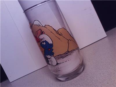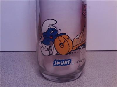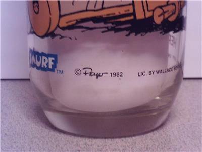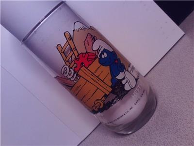ITEM BEING OFFERED: Vintage 1982 HEFTY w/WAGON FILLED WITH LADDER , GEARS BOARDS ECT AND ANOTHER SMURF IS ROLLING A BROKEN WHEEL Cart SWANKY SWIG PEYO DRINKING GLASS