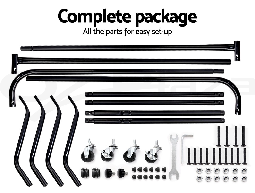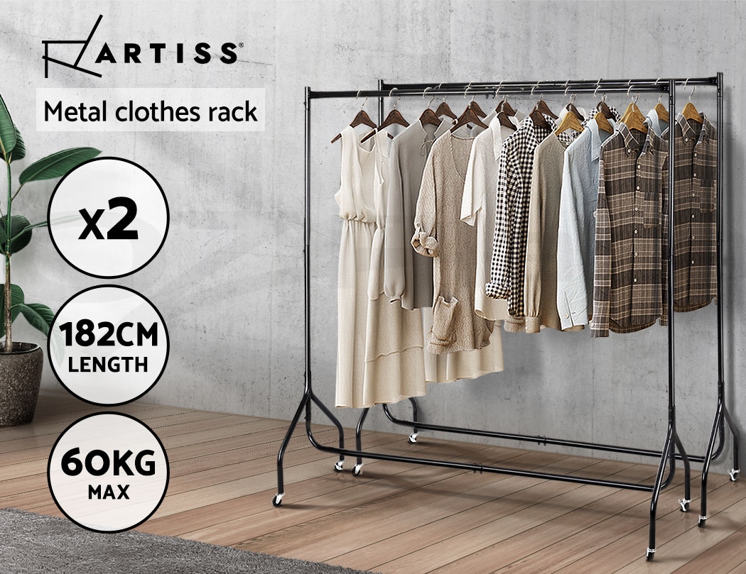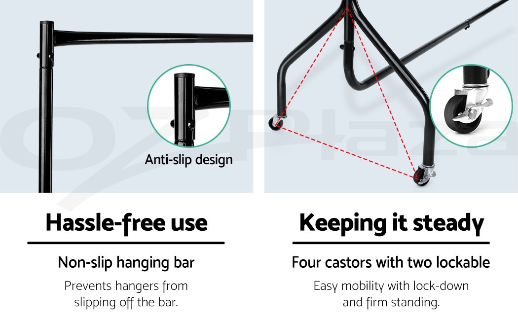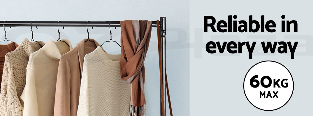 Simple and yet extremely practical. Our black metal clothes rack adds a stylish presence to your bedroom and wardrobe. Better still, its powder-coated steel structure is sturdy and strong with reliable fixings to keep it in shape at all times. With up to 60kg maximum capacity, this clothes rack is no pushover when it comes to hanging all sorts of apparels. And its anti-slip design adds a considerate touch to prevent hangers from slipping off the hanging bar. Not least, its four castors with two that are lockable means that you have this rack anywhere in your home, shop or studio with minimum fuss.