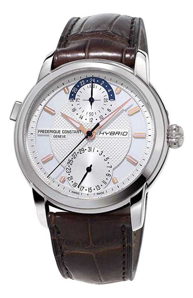 Frederique Constant Classic Hybrid Manufacture Automatic Mens Horological Smartwatch Worldtimer Dual Time Zone Stainless Steel Brown Leather Silver Dial Model# FC-750V4H6 / FC750V4H6 features a polished stainless steel case that holds the light silver textured dial. The dial has rose gold tone & luminous hand indicators, rose gold tone & luminous index hour markers. Push/Pull crown, Scratch resistant sapphire crystal and a transparent case back. Functions: world time, date, GMT, second time zone, hour, minute, second, vibration/sound notifications, activity tracking, sleep monitoring, analytics and dynamic coach. Date displayed in sub-dial at the 6 o'clock position. Brown Genuine Alligator leather strap has a deployment clasp. This watch runs on a Swiss automatic movement based upon ETA 7750, Caliber FC-750, containing 33 Jewels, bitting at 28800 vph, 42 hour power reserve, and is water-resistant up to 50 meters/165 feet.