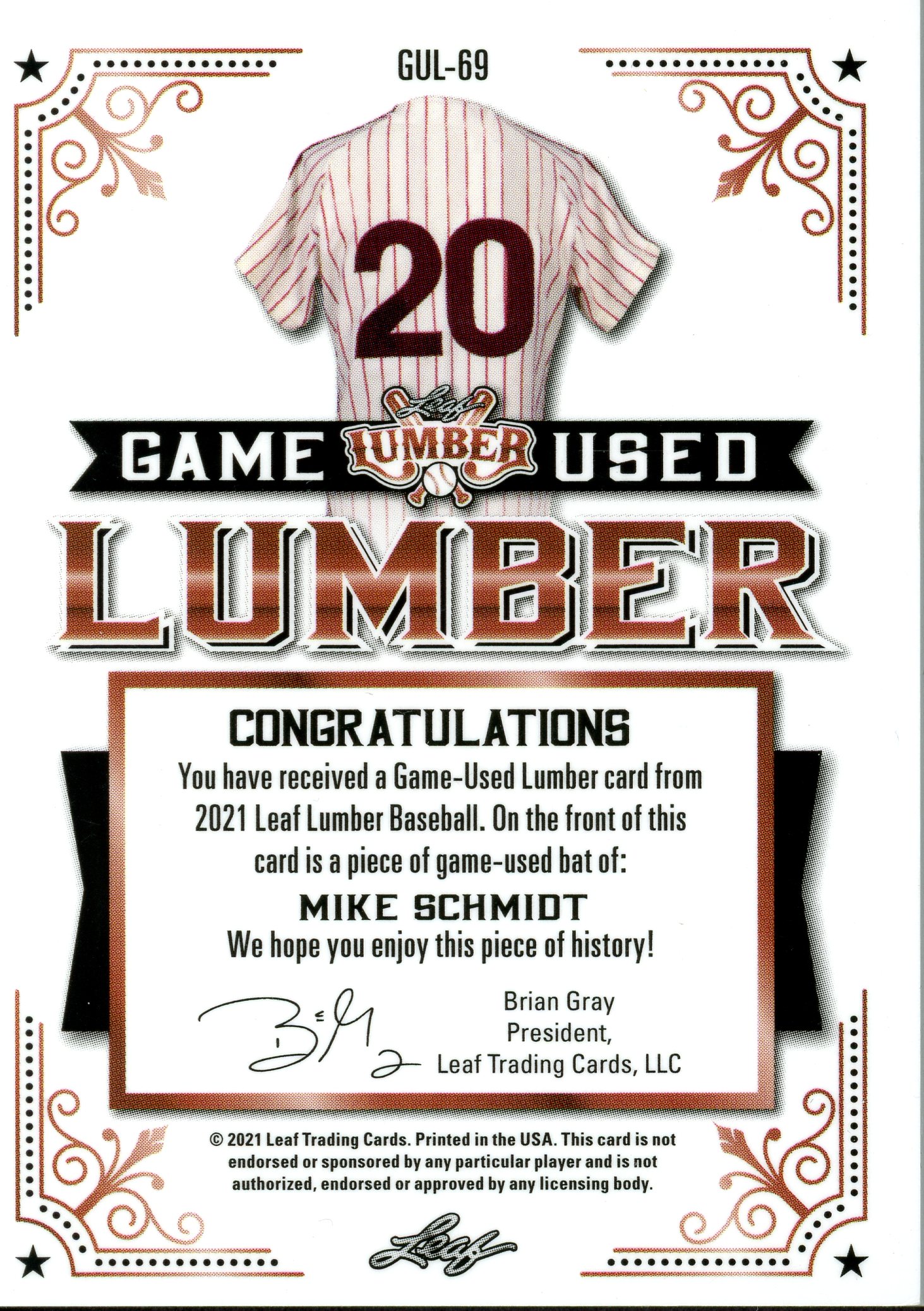 MIKE SCHMIDT ~ 2021 Leaf Lumber Game Used Lumber Platinum #GUL69 BAT (#1/6)