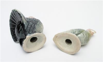 Each of these delightful figural shakers have been beautifully modelled into the freestanding shape of a turkey and richly glazed in striking graduated tones of dark green, yellow and pink. The male turkey is captured putting on a show with his elaborate wide fan of tail feathers on display to the rather more demure female figure. Each piece has an appealing texture which enhances the sparkle of the glossy glazes while adding a wonderful tactile element to the design.