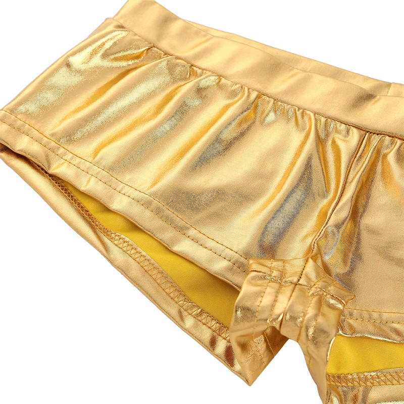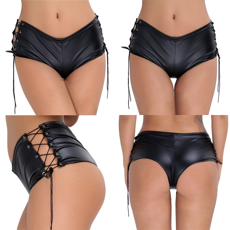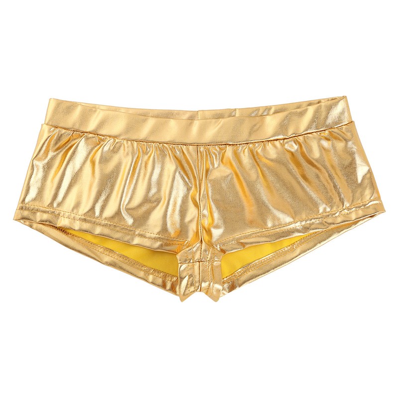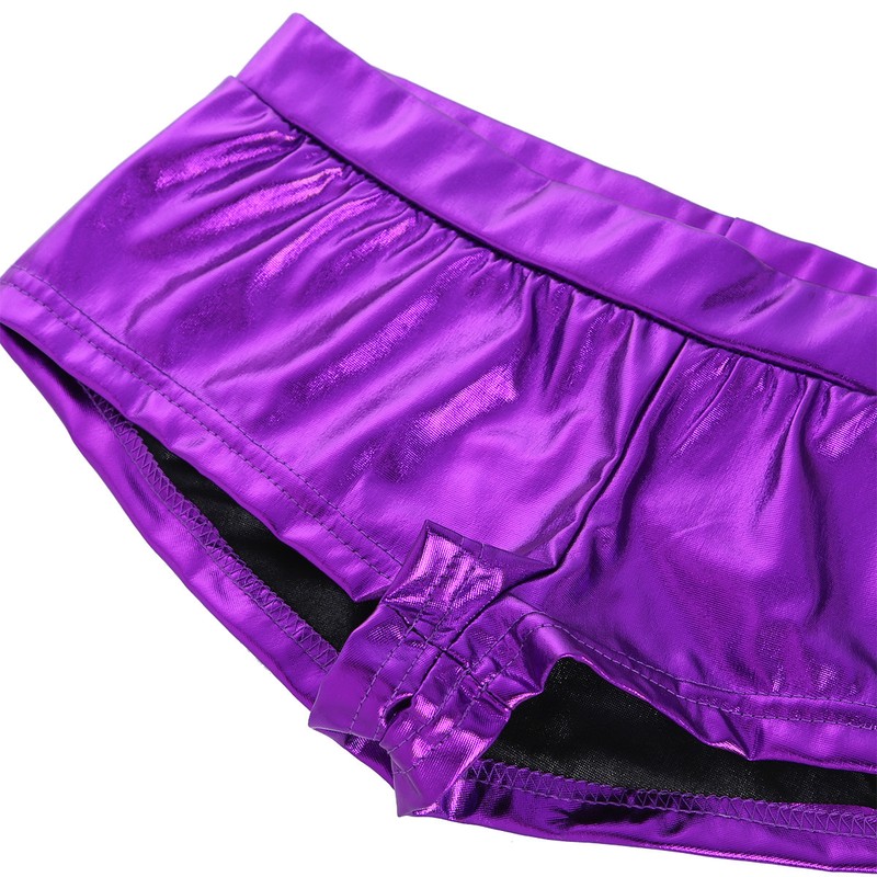 Low rise with wide elastic waistband, shiny surface, pull on closure.