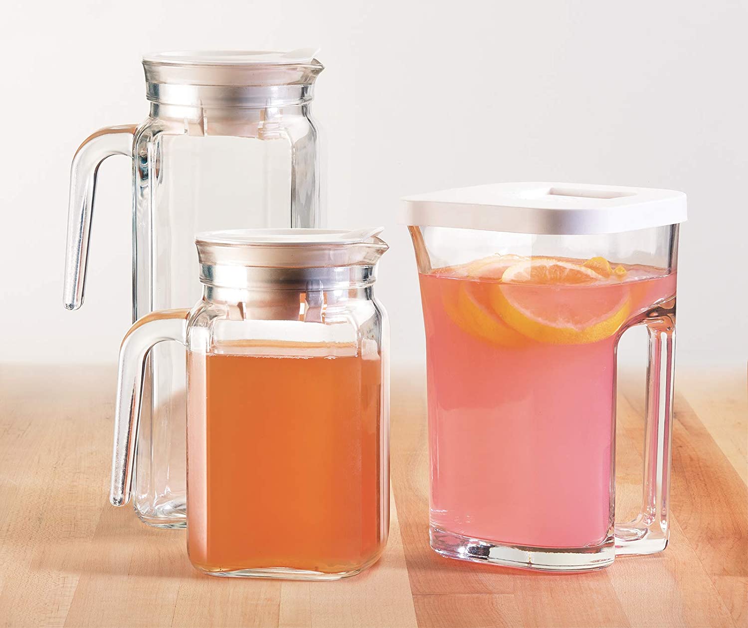 - PERFECT POUR - The white plastic lid provides a controlled pour rate, and the opened handle allows for easy carrying and pouring. The clear glass body allows you to clearly see what beverage is inside the pitcher