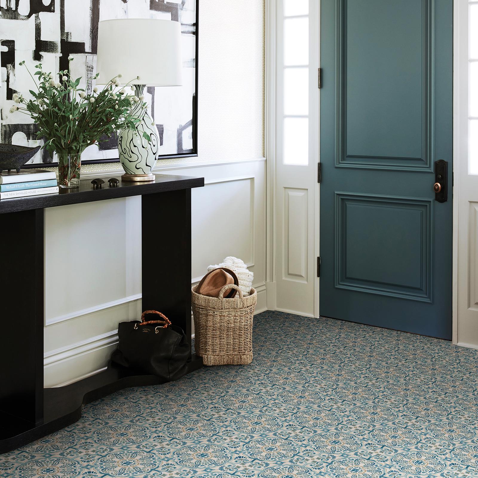 Transform a room with ease with these simple to use Floorpops Peel & Stick Floor Tiles. The intricate design features a beautiful Moroccan style pattern in soft blue and beige tones for a stylish finish. Ideal for most flat surfaces, these tiles require no grout or specialist tools and are water resistant, trimmable and easy to clean. The self-adhesive tiles are made from hard wearing vinyl and have a lightly textured low gloss finish.