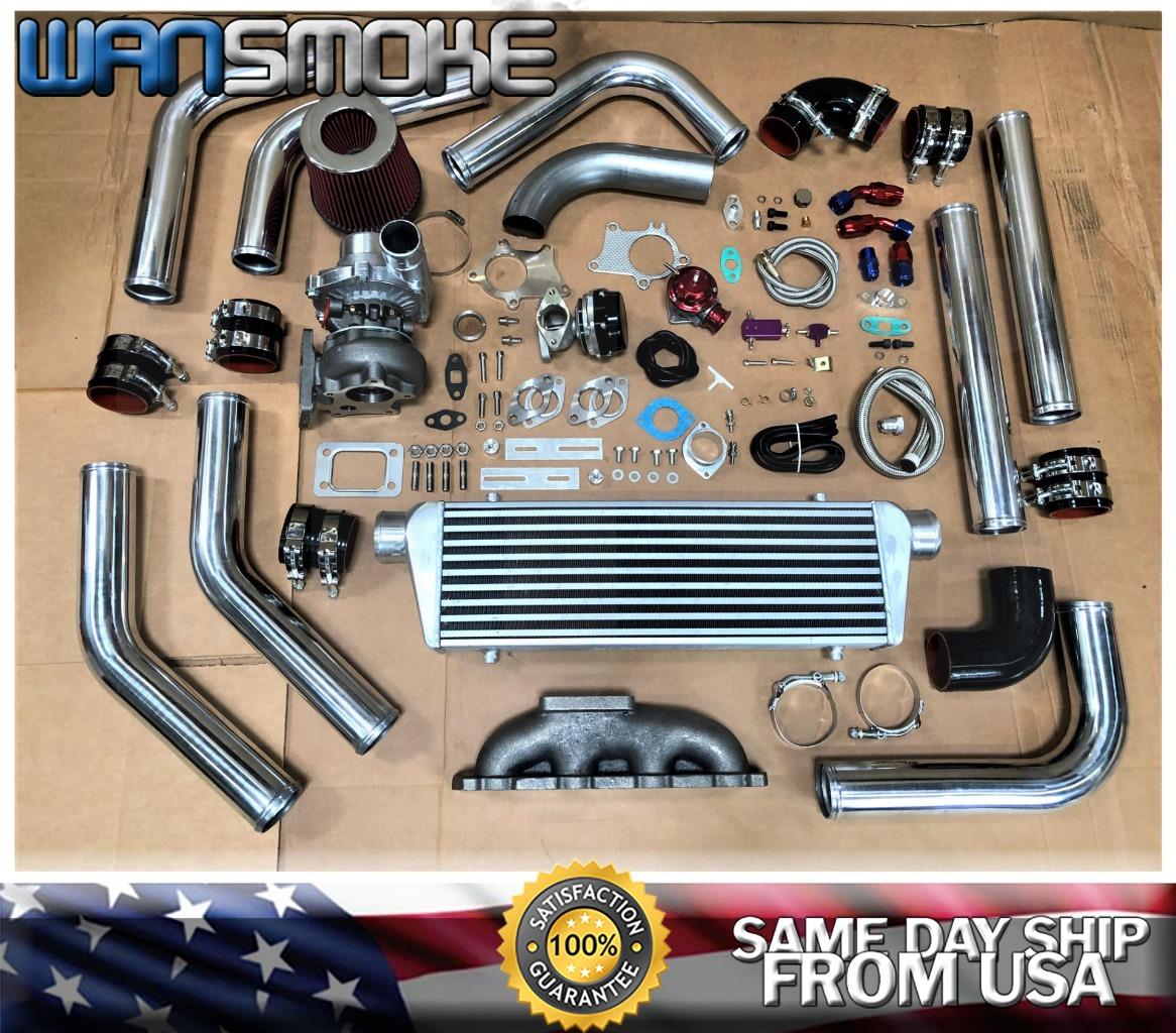 ~~~WANSMOKE~~~ Fast Shipping, 100% Customer Satisfaction ! WANSMOKE has the best products with the best prices. We believe in Safety and Standards in both machining and manufacturing. Unlike our competitors who offer you low prices for inferior products, we build products that lift and level your vehicle without compromise. Cutting corners is awesome when driving your car but not when manufacturing, buy right, choose Supreme. 2000-2003 Audi A3 1.8T (8L) NOT S3 1999-2006 Audi TT 1.8T (8N) NOT 225PS 1998-2005 Seat Leon 1.8T (1M) 1998-2007 VW Bora Jetta (1.8T 1J) 1998-2007 VW Golf IV GTI 1.8T (1J) Seat Cordoba 1.8T (6K) Seat Ibiza III 1.8T (6K) Skoda Octavia 1.8T (1U) Fits vehicles running with Volkswagen 1.8T / 8L 8N 1M 1J 6K 1U **VW Golf, Jetta, GTI, & New Beetle **VW Part numbers: 06A253033AB & 06A253033AL Includes - T3/T4 Turbocharger Includes - Turbo Manifold Includes - Front Mount Intercooler Includes - Intercooler Mounting Kit Includes - Piping Kit Includes - Silicone Coupler Includes - T-Bolt Clamp Includes - Air Intake Filter Includes - Blow off Valve Includes - BOV adapter Flange Includes - External Wastegate Includes - Steel Tube Includes - Manual Boost Controller Includes - Oil Feed Line Includes - Oil Restrictor Adapter Includes - Oil Return Drain Line Includes - Oil Pan Drain Plug Adapter Includes - T3 4 Bolt Gasket Includes - T3 5 Bolt Flange + Gasket T3/T4 TURBOCHARGER 100% Brand New T3/T4 Hybrid Turbocharger! High Quality Guaranteed! cast housing with durable steel. Capable of boosting horse power up To 350+ BHP, standard 4 bolt exhaust flange, Capable of 8 PSI or 15-25 PSI output at peak power. CNC machined flanges. Internal wastegate setting: 8 PSI. High quality t04e with a forged turbine propeller wheel! Turbo Specification: - Standard 5 bolt T3 Flange. - 5 Bolt Standard Hot Side. - Standard T3/T4 Flange. - Oil Inlet - 1/8 NPT Oil Inlet. - Bearing Type - Journal Bearing. - Wet Floating Bearings. - Cooling Type: Oil Cooled. Compressor Specs: - 3" Compressor Inlet. - 2.07" Inducer. - 2.36" Major. - 2" Compressor Outlet . - T04B/T4 Type Compressor Housing. - Compressor .50 A.R. - Compressor .57 Trim. - 8 Blade Type T4 Compressor Wheel. Turbine Size: - T3 Type 4 Bolt Turbine flange. - 5 bolt Exhaust flange. - Turbine .63 A.R. - 2.48" Minor and 2.89" Major Propellar. - T3 Turbine Housing. - 2.274" Outlet TURBO MANIFOLD 1. Standard T3/ T4 (T03/ T04) Turbo Flange Configuration Outlet. 2. Included Wastegate Flange for 35mm/38mm external WG. 3. Increase Engine Intercooler Output and Efficiency. 4. Made of High Quality Cast Iron Material for Strength and Durability. INTERCOOLER: 1. 6061 Light Weight Billet Aluminum Construction. 2. Tube & Fin Light Weight Design. 3. Construction: Machine Cut and Stamped Hand Welded. 4. Working Pressure: 5~50PSI. 5. Pressure Drop:2~5psi@35psi;0.2~0.5psi@15psi. 6. Hot Air Temperature: 32°F~302°F (0°C~150°C) 7. Compress Air Flow Rate: < 350 Cubic Feet/Min Rated to 500 Max HP. 8. Overall Size - 27" x 7" x 2.5" 9. Core Size - 21" x 6.5" x 2.5" 10. In/Outlet - 2.5" OD / 2.25" ID PIPING: 1. Made of High quality T-6061 LIGHTWEIGHT Aluminum Piping. 2. Powder-Coated Surface Finish. 3. 2.5" Piping Diameter. 4. 2.0mm Pipe Thickness. 5. Increase 65% Air Flow comparing with other Standard Piping. SILICONE COUPLER: 1. Made of high quality silicone material 2. Thickness of wall:5 mm, 4 ply reinforced 3. Working Pressure: 0.3 Mpa (43.5 PSI) to 0.9 Mpa (130.5 PSI) 4. Bursting Pressure: 2 Mpa 5. Working Temperature: -76°F (-60°C ) to +500°F (+260°C) 6. Size tolerance:+/-0.5 mm T-BOLT CLAMP: 1. Made of High quality 301 SS Stainless Steel Clamp 2. Stainless steel construction resists corrosion 3. Provide uniform sealing pressure for a positive 4. Polished finish increases engine bay aesthetics AIR FILTER: 1. Oil-free filter Micro cotton gauze type filter material washable with water or soap and reusable. 2. Improves Up to 95% Filtration Efficiency. 3. Designed to increase horsepower and acceleration. 4. Width: 6" Inlet: 3.0" Overall Tall: 3.5" Mesh Tall: 2.5" BLOW OFF VALVE: 1. Aggressive JDM racing discharge sound. 2. 8 Discharge ports that draw in surrounding air and release a unique discharge sound. 3. 40mm hard-anodized valve for increased airflow. 4. Dual spring system promoted response and allows for high boost pressures. 5. Support up to 30 PSI boost pressure. OIL LINE: 1. OIL DRAIN FEED LINE. 2. 10AN Fittings. 3. Inner Diameter: 0.50" 4. Length: 17.00" 5. CNC Machined Turbo Adapter Plate. 6. Weldable 10AN Oil Pan Fitting Included. 7. Inner Diameter: 0.25" 8. Length: 36.00" 9. 1/8 NPT Fittings Natural Polish Finish. 10. CNC Machined Turbo Adapter Plate. 11. Brass Fitting Block Fitting and Port Cover Included BOOST CONTROLLER: 1. Allows to adjust PSI ratings without changing the wastegate springs as well as replacing the wastegate springs. 2. High Performance Manual Boost Control From 0~30 psi Capacity. 3. CNC Machined Light Weight and Resistant to Rust. 4. Hose clamp and all necessary hardware for complete installation. 5. 1-30 PSI Adjustable. WASTEGATE: 1. High strength Alloy aluminum body with steel head. 2. Comes with 7 psi spring installed. 3. Protect the turbo system from over boosting. 4. Complete install kit included . GASKET FLANGE ADAPTER: 1. High Quality Cast Raw Steel 2. 4 & 5 bolt for T3 Turbo 3. Single Entry T3 Turbo Flange 4. 12mm(almost 1/2") Thick 5. Bolt Diameter: M10 Thru Holes 6. Holes, Holes Are Drilled Through, Not Threaded. 7. Fits all T3 and T3/T4 hybrid turbos with 4 & 5 bolt standard size inlet STEEL TUBE: 2.5" t3/t4 steel TIG welded . Fits all of our turbo kits that feature a turbocharger with a 5-bolt exhaust housing. This provides a simple starter solution for connecting your turbo's exhaust to your existing exhaust system. The pictured metal composite Flange is included! ATTENTION: 1. For emissions related items please check with your local jurisdiction for emission specific requirements before purchasing. NO installation in