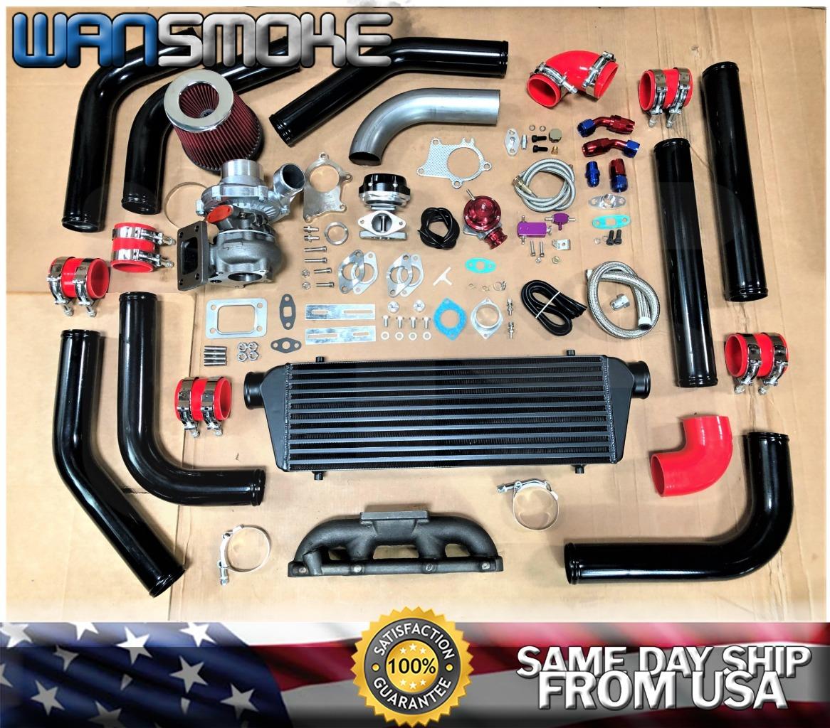 ~~~WANSMOKE~~~ Fast Shipping, 100% Customer Satisfaction ! WANSMOKE has the best products with the best prices. We believe in Safety and Standards in both machining and manufacturing. Unlike our competitors who offer you low prices for inferior products, we build products that lift and level your vehicle without compromise. Cutting corners is awesome when driving your car but not when manufacturing, buy right, choose Supreme. 2000-2003 Audi A3 1.8T (8L) NOT S3 1999-2006 Audi TT 1.8T (8N) NOT 225PS 1998-2005 Seat Leon 1.8T (1M) 1998-2007 VW Bora Jetta (1.8T 1J) 1998-2007 VW Golf IV GTI 1.8T (1J) Seat Cordoba 1.8T (6K) Seat Ibiza III 1.8T (6K) Skoda Octavia 1.8T (1U) Fits vehicles running with Volkswagen 1.8T / 8L 8N 1M 1J 6K 1U **VW Golf, Jetta, GTI, & New Beetle **VW Part numbers: 06A253033AB & 06A253033AL Includes - T3/T4 Turbocharger Includes - Turbo Manifold Includes - Front Mount Intercooler Includes - Intercooler Mounting Kit Includes - Piping Kit Includes - Silicone Coupler Includes - T-Bolt Clamp Includes - Air Intake Filter Includes - Blow off Valve Includes - BOV adapter Flange Includes - External Wastegate Includes - Steel Tube Includes - Manual Boost Controller Includes - Oil Feed Line Includes - Oil Restrictor Adapter Includes - Oil Return Drain Line Includes - Oil Pan Drain Plug Adapter Includes - T3 4 Bolt Gasket Includes - T3 5 Bolt Flange + Gasket T3/T4 TURBOCHARGER 100% Brand New T3/T4 Hybrid Turbocharger! High Quality Guaranteed! cast housing with durable steel. Capable of boosting horse power up To 350+ BHP, standard 4 bolt exhaust flange, Capable of 8 PSI or 15-25 PSI output at peak power. CNC machined flanges. Internal wastegate setting: 8 PSI. High quality t04e with a forged turbine propeller wheel! Turbo Specification: - Standard 5 bolt T3 Flange. - 5 Bolt Standard Hot Side. - Standard T3/T4 Flange. - Oil Inlet - 1/8 NPT Oil Inlet. - Bearing Type - Journal Bearing. - Wet Floating Bearings. - Cooling Type: Oil Cooled. Compressor Specs: - 3" Compressor Inlet. - 2.07" Inducer. - 2.36" Major. - 2" Compressor Outlet . - T04B/T4 Type Compressor Housing. - Compressor .50 A.R. - Compressor .57 Trim. - 8 Blade Type T4 Compressor Wheel. Turbine Size: - T3 Type 4 Bolt Turbine flange. - 5 bolt Exhaust flange. - Turbine .63 A.R. - 2.48" Minor and 2.89" Major Propellar. - T3 Turbine Housing. - 2.274" Outlet TURBO MANIFOLD 1. Standard T3/ T4 (T03/ T04) Turbo Flange Configuration Outlet. 2. Included Wastegate Flange for 35mm/38mm external WG. 3. Increase Engine Intercooler Output and Efficiency. 4. Made of High Quality Cast Iron Material for Strength and Durability. INTERCOOLER: 1. 6061 Light Weight Billet Aluminum Construction. 2. Tube & Fin Light Weight Design. 3. Construction: Machine Cut and Stamped Hand Welded. 4. Working Pressure: 5~50PSI. 5. Pressure Drop:2~5psi@35psi;0.2~0.5psi@15psi. 6. Hot Air Temperature: 32°F~302°F (0°C~150°C) 7. Compress Air Flow Rate: < 350 Cubic Feet/Min Rated to 500 Max HP. 8. Overall Size - 27" x 7" x 2.5" 9. Core Size - 21" x 6.5" x 2.5" 10. In/Outlet - 2.5" OD / 2.25" ID PIPING: 1. Made of High quality T-6061 LIGHTWEIGHT Aluminum Piping. 2. Powder-Coated Surface Finish. 3. 2.5" Piping Diameter. 4. 2.0mm Pipe Thickness. 5. Increase 65% Air Flow comparing with other Standard Piping. SILICONE COUPLER: 1. Made of high quality silicone material 2. Thickness of wall:5 mm, 4 ply reinforced 3. Working Pressure: 0.3 Mpa (43.5 PSI) to 0.9 Mpa (130.5 PSI) 4. Bursting Pressure: 2 Mpa 5. Working Temperature: -76°F (-60°C ) to +500°F (+260°C) 6. Size tolerance:+/-0.5 mm T-BOLT CLAMP: 1. Made of High quality 301 SS Stainless Steel Clamp 2. Stainless steel construction resists corrosion 3. Provide uniform sealing pressure for a positive 4. Polished finish increases engine bay aesthetics AIR FILTER: 1. Oil-free filter Micro cotton gauze type filter material washable with water or soap and reusable. 2. Improves Up to 95% Filtration Efficiency. 3. Designed to increase horsepower and acceleration. 4. Width: 6" Inlet: 3.0" Overall Tall: 3.5" Mesh Tall: 2.5" BLOW OFF VALVE: 1. Aggressive JDM racing discharge sound. 2. 8 Discharge ports that draw in surrounding air and release a unique discharge sound. 3. 40mm hard-anodized valve for increased airflow. 4. Dual spring system promoted response and allows for high boost pressures. 5. Support up to 30 PSI boost pressure. OIL LINE: 1. OIL DRAIN FEED LINE. 2. 10AN Fittings. 3. Inner Diameter: 0.50" 4. Length: 17.00" 5. CNC Machined Turbo Adapter Plate. 6. Weldable 10AN Oil Pan Fitting Included. 7. Inner Diameter: 0.25" 8. Length: 36.00" 9. 1/8 NPT Fittings Natural Polish Finish. 10. CNC Machined Turbo Adapter Plate. 11. Brass Fitting Block Fitting and Port Cover Included BOOST CONTROLLER: 1. Allows to adjust PSI ratings without changing the wastegate springs as well as replacing the wastegate springs. 2. High Performance Manual Boost Control From 0~30 psi Capacity. 3. CNC Machined Light Weight and Resistant to Rust. 4. Hose clamp and all necessary hardware for complete installation. 5. 1-30 PSI Adjustable. WASTEGATE: 1. High strength Alloy aluminum body with steel head. 2. Comes with 7 psi spring installed. 3. Protect the turbo system from over boosting. 4. Complete install kit included . GASKET FLANGE ADAPTER: 1. High Quality Cast Raw Steel 2. 4 & 5 bolt for T3 Turbo 3. Single Entry T3 Turbo Flange 4. 12mm(almost 1/2") Thick 5. Bolt Diameter: M10 Thru Holes 6. Holes, Holes Are Drilled Through, Not Threaded. 7. Fits all T3 and T3/T4 hybrid turbos with 4 & 5 bolt standard size inlet STEEL TUBE: 2.5" t3/t4 steel TIG welded . Fits all of our turbo kits that feature a turbocharger with a 5-bolt exhaust housing. This provides a simple starter solution for connecting your turbo's exhaust to your existing exhaust system. The pictured metal composite Flange is included! ATTENTION: 1. For emissions related items please check with your local jurisdiction for emission specific requirements before purchasing. NO installation in