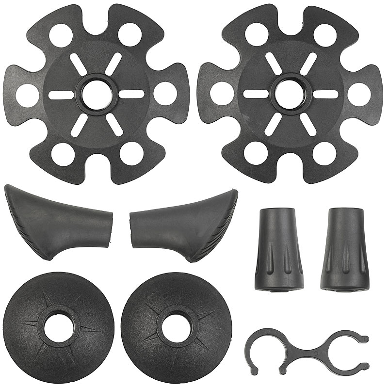 - Trekking-Stöcke inklusive 2 Asphalt-Pads, 2 Trekking-Tellern, 2 Schneetellern und Halte-Clip