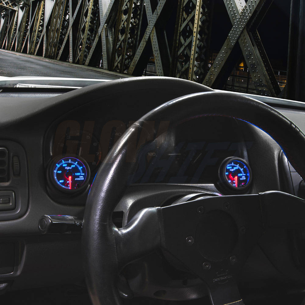 GlowShifts Black 7 Color Gauge Series features a black gauge face, magnified clear lens and illuminated red needle that sweeps 270°. These gauges are also equipped with stepper motor technology which gives them a combination of accurate readings and extremely smooth needle movement. The Black 7 Color Gauge Series includes the ultra-bright LED solid color modes Blue, Green, Red, Teal, Yellow, Purple and White. With GlowShifts 7 color LED through dial lighting system you can select and change the color of your gauge display by simply pressing the button located on the front of the gauge.