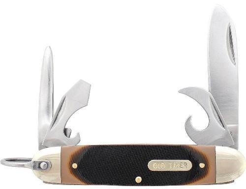 Old Timer Traditional Scout Pocket Knife. 7Cr17MoV High Carbon Stainless Steel Drop Point, Can Opener, Screwdriver & Cap Lifter, and Awl, Old Timer Saw Cut Handles, Nickel Silver Bolsters, Brass Pins & Liners, Heath Treated Back Springs, Shackle