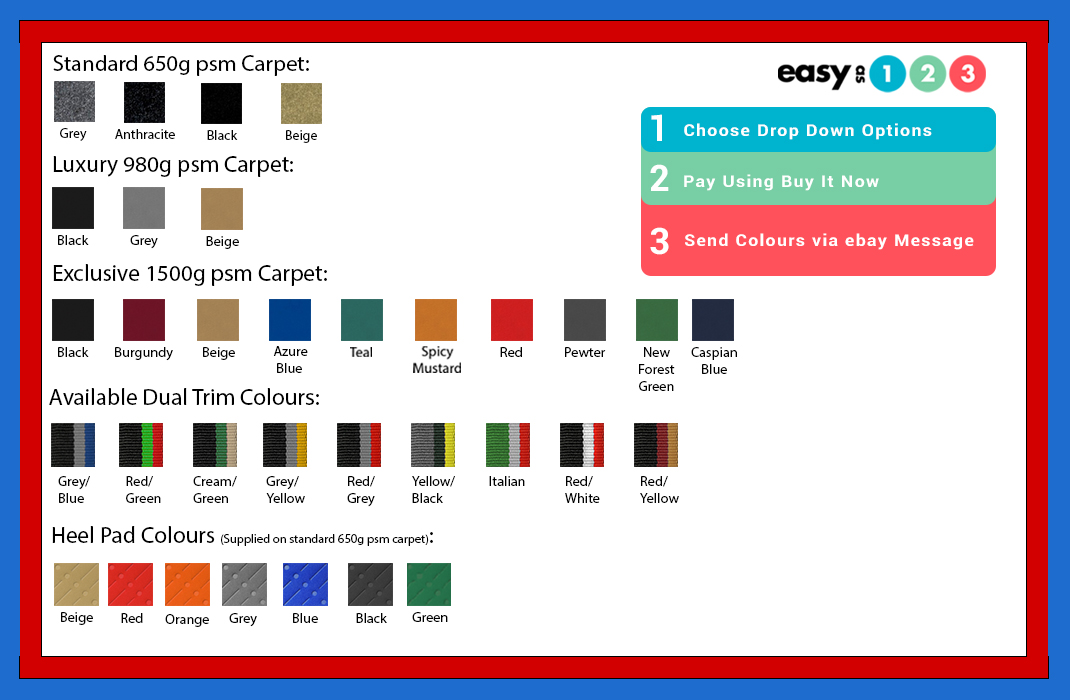 - Supplied in a black carpet with a black heel pad (standard 650g psm carpet only) unless stated differently at the checkout