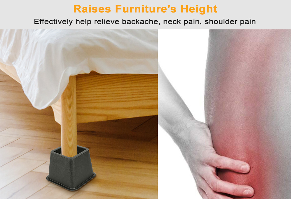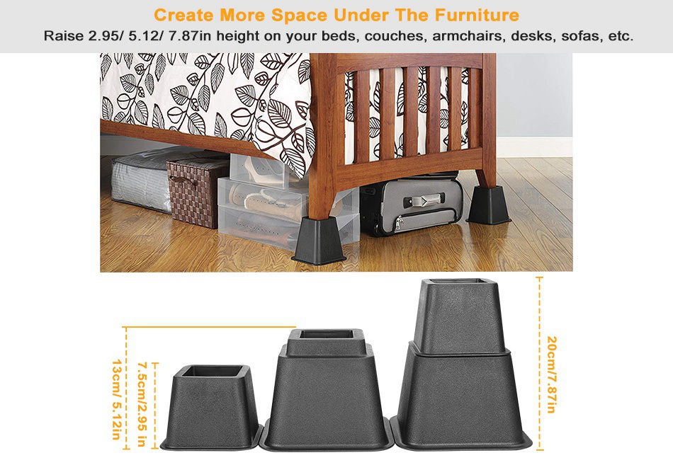 - *IMPROVE LIFE QUALITY:Raises height of beds,desks,sofas,tables and other heavy furniture to a more ergonomically height that effectively relieves backache,neck pain,shoulder pain. Moreover,it's helpful to effectively utilize under-the-bed storage and safely hoist your beds or furniture to an extra 2.95 in/ 5.12in/7.87in height.