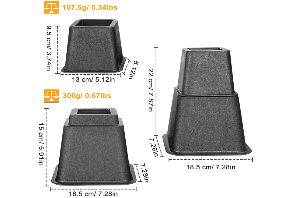 8Pcs Furniture Risers 500kg 1100lbs Capacity Bed Lifters Adjustable Couch Table Chair Risers Product Detail Image GalleryProduct DescriptionOverview:Come with 8 pieces of furniture risers (4 large, 4 small), Our Adjustable furniture risers are helpful to hoist furniture to a more ergonomically height, such as: beds, desks, sofas, tables and other heavy furniture, which effectively relieves backache, neck pain, shoulder pain. And it’s helpful to effectively utilize under-the-bed storage and safely hoist your beds or furniture to an extra 2.95 in/ 5.12in/ 7.87in height. Besides, it’s made of high-strength PP plastic which is more stable, safer and with high bearing capacity of 500kg/1100lbs, no worry of crack when loading mass. Not only practical but also with nice and exquisite appearance for your home decoration. Features:- *8-PIECE SET & ADJUSTABLE:Come with 8 pieces of furniture risers(4 large,4 small),which are helpful to rise the height of furniture. Also,the small riser can be superimposed on the large one to increase the rising height to 7.87in.