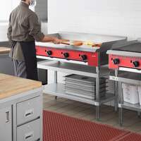 Perfect for busy operations that are tight on space, this Avantco Chef Series CAG-48-TG 48" countertop gas griddle with thermostatic controls adds easy compact convenience to your kitchen! The unit is space efficient, designed specifically for your kitchen countertop and allows you to maximize every inch of work space. With (4) 35,000 BTU burners, it is ideal for cooking burgers, pancakes, or vegetable skewers, as each burner can be set to a different temperature. For quality performance, the griddle surface is 3/4" thick, ensuring quick recovery and convenient heat retention, saving you money and keeping your kitchen cool.