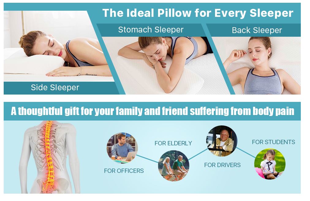 ღ【Cervical Memory Foam Pillow】 Cervical pillows are well ergonomically designed to support by following the natural curve of your body keeps air passages optimal for less snoring and more restful sleep. The cutouts on the side give your top arm a place to rest and keep it at an angle so your shoulder is not hunching over in front of you.