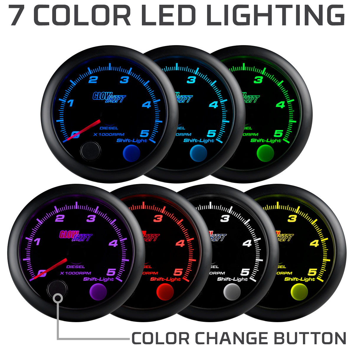 GlowShift Black 7 Color Series Gauges have a black gauge dial, magnified clear lens and illuminated red needle that sweeps 270°. Each analog diesel tachometer gauge is equipped with stepper motor technology that creates a combination of accurate readings and extremely smooth needle movement. Solid color modes include Blue, Green, Red, Teal, Yellow, Purple and White. With the through dial lighting system you can select and change the color of your gauge display by simply pressing the button on the front.