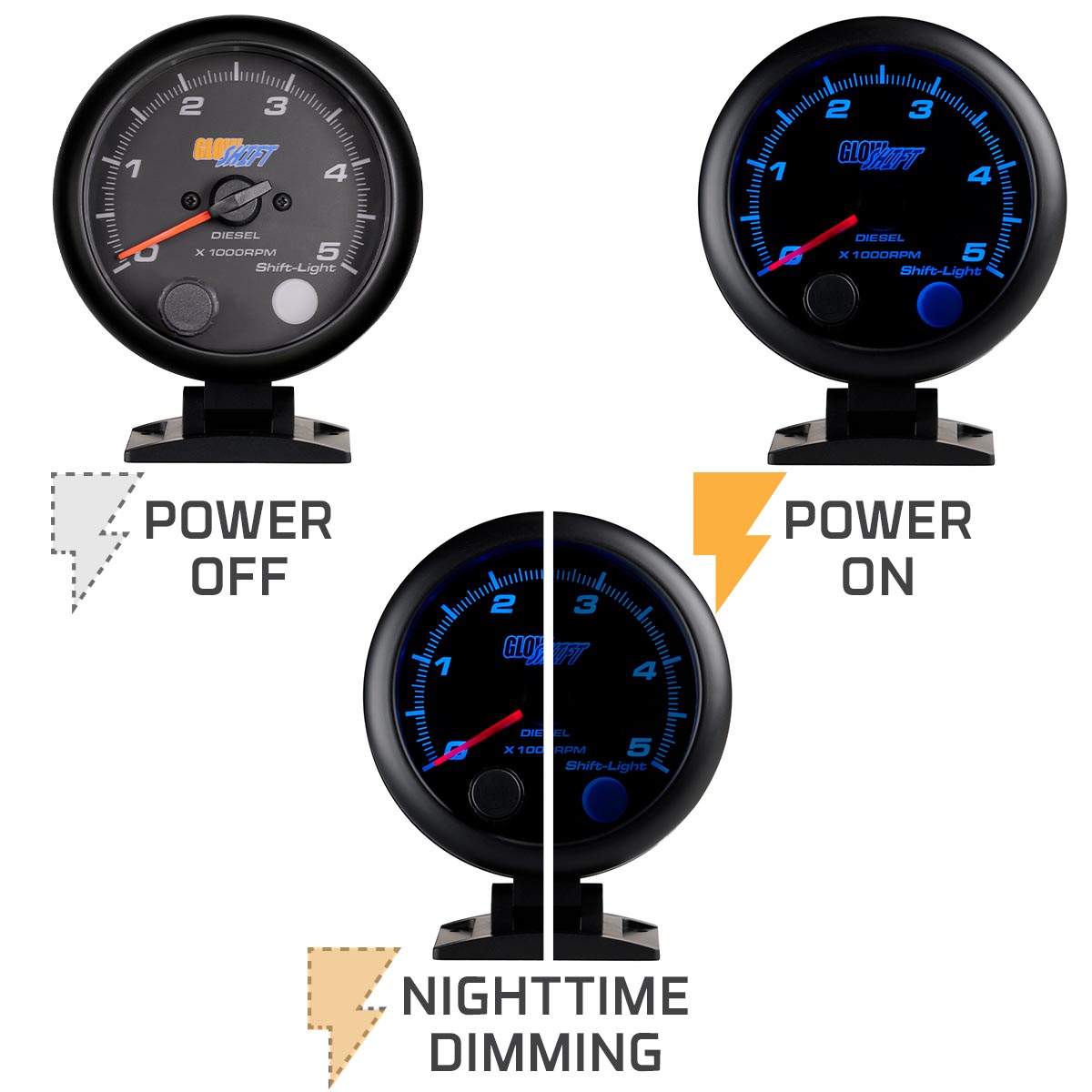 GlowShifts Black 7 Color Series 3-3/4 Diesel Tachometer with Shift Light reads from 0 to 5,000 RPM with incredible accuracy. Featuring an adjustable RPM signal range for various installs, this on-dash diesel tach can be added to virtually any diesel-driven car or truck. Ensure you are shifting at the right time using the built-in Shift Light and also protect against unnecessary transmission wear. You can easily adjust the Shift Light with the button located on the front of the gauge. A 2 Signal & Power Wire is included so you can connect directly to the RPM Tachometer Signal.