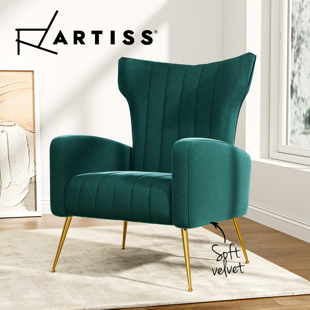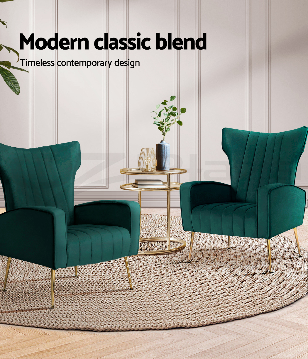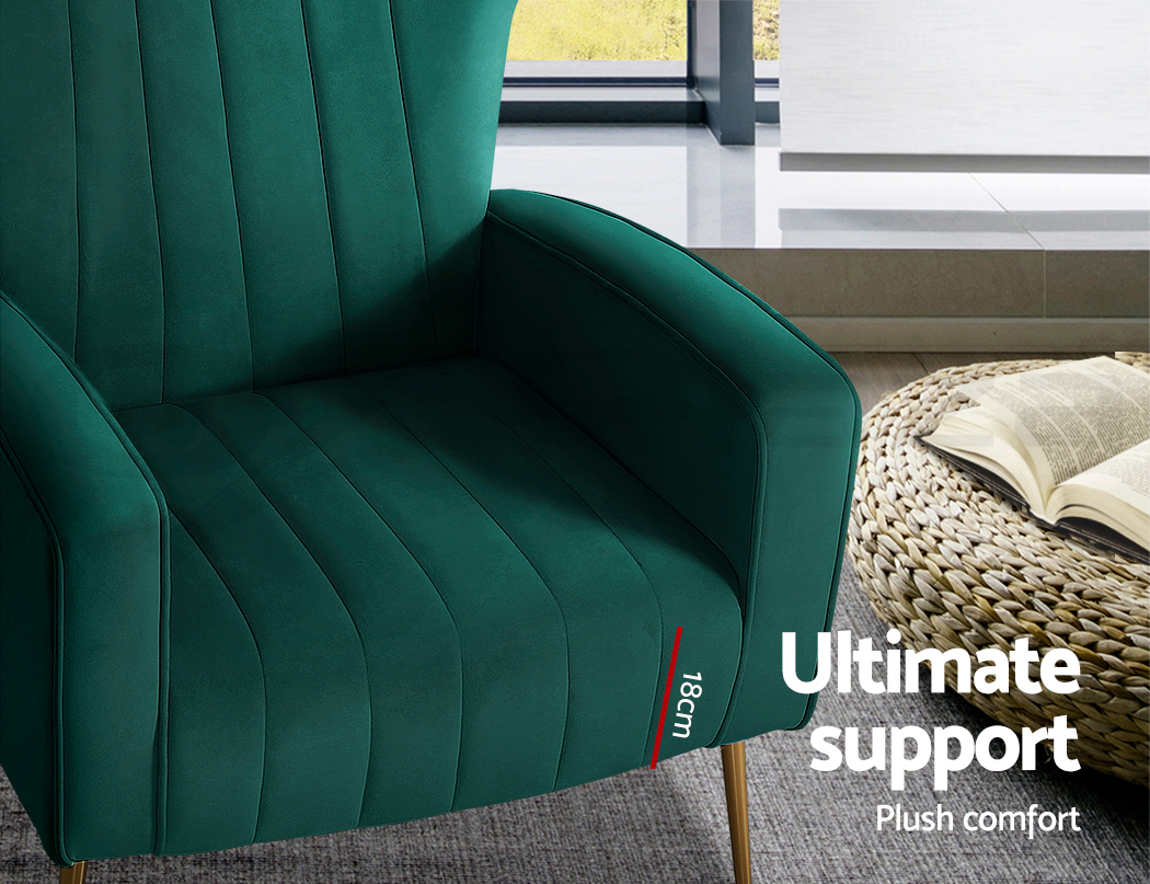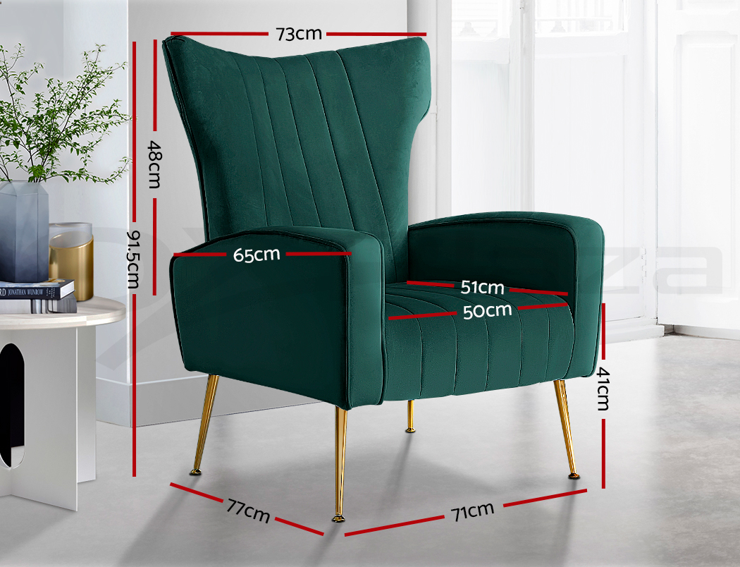 Artiss Kate armchair offers a wide, high-back, and welcoming seat with comfortable armrests for you to relax. It is ideal for every corner of your space where you want to add soft and comfy touches. Crafted with great attention to details, this armchair feature solid wood construction with high resilience foam. It is quite sturdy and will withstand the test of time. Our Kate armchair is upholstered in soft velvet fabric that epitomises luxury with its smooth and shiny appearance and adds a cosy and relaxing feel to your space. Plus, the splayed golden metal legs with floor protectors will offer optimum stability and protection to your floors and add a luxurious charm to your space with its gorgeous presence.