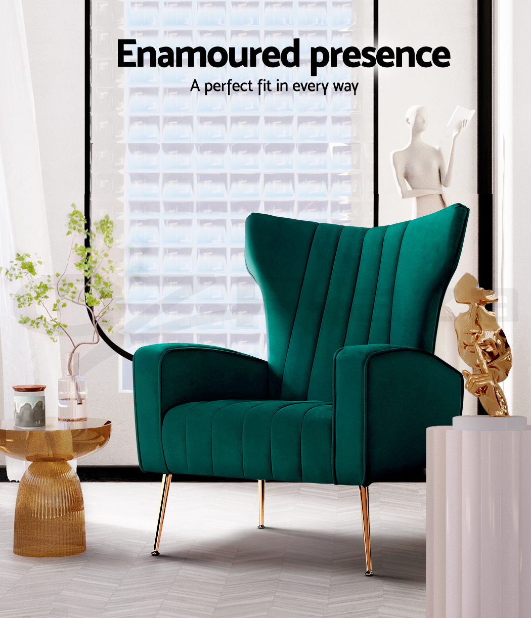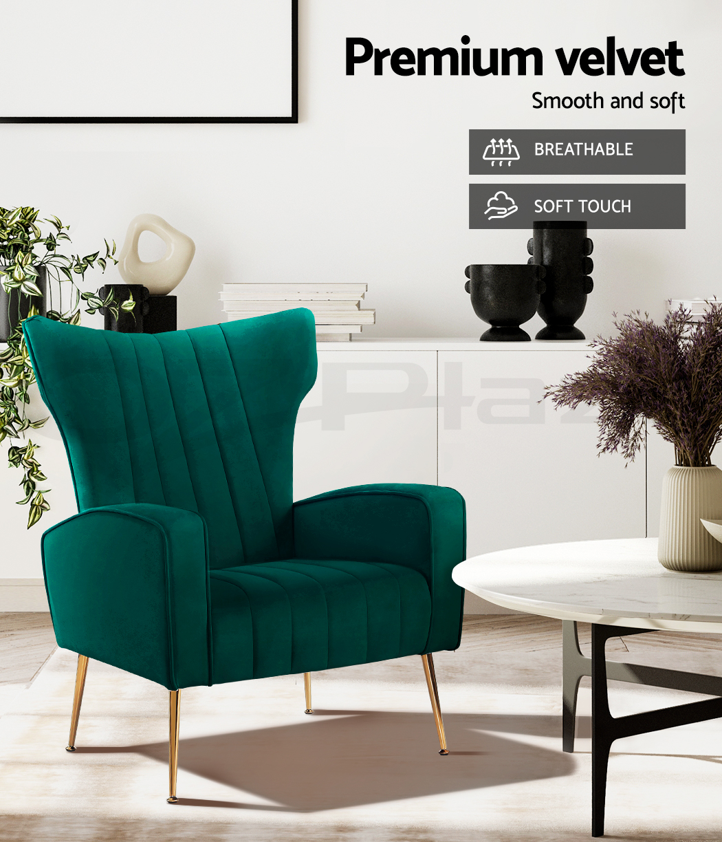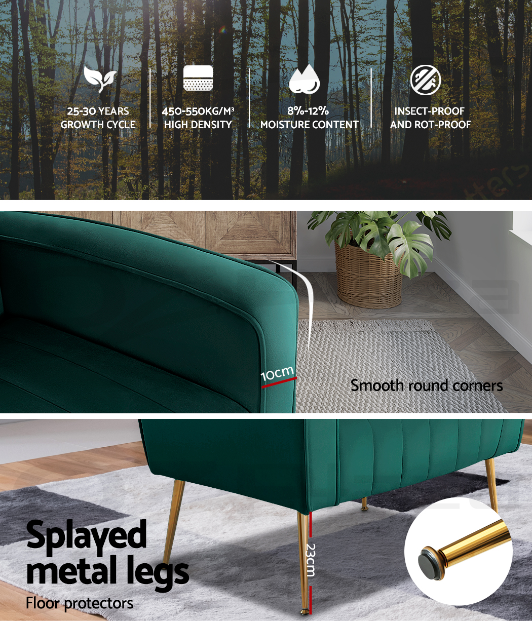 Artiss Kate armchair offers a wide, high-back, and welcoming seat with comfortable armrests for you to relax. It is ideal for every corner of your space where you want to add soft and comfy touches. Crafted with great attention to details, this armchair feature solid wood construction with high resilience foam. It is quite sturdy and will withstand the test of time. Our Kate armchair is upholstered in soft velvet fabric that epitomises luxury with its smooth and shiny appearance and adds a cosy and relaxing feel to your space. Plus, the splayed golden metal legs with floor protectors will offer optimum stability and protection to your floors and add a luxurious charm to your space with its gorgeous presence.