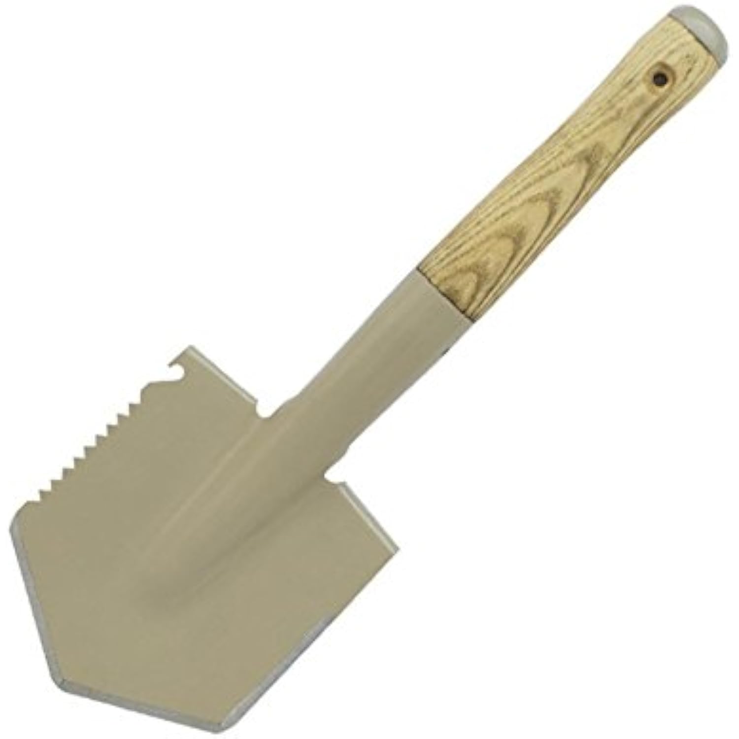 The Condor camping shovel is 16in long, with a shovel head length of 6in, and a thickness of 0.07in. The shovel head is constructed of 1045 high carbon steel and is heat treated and annealed to 40-45 Rockwell C. Coated in a non-reflective Desert powder coating with a texture that is designed for tactical use, rust, and abrasion resistance. The handle is made of burnt American ash making it strong while also giving spears and axes an ancient look. This ballistic nylon sheath is sturdy and is double stitched and reinforced for heavy duty use. It's also far quieter than Kydex.