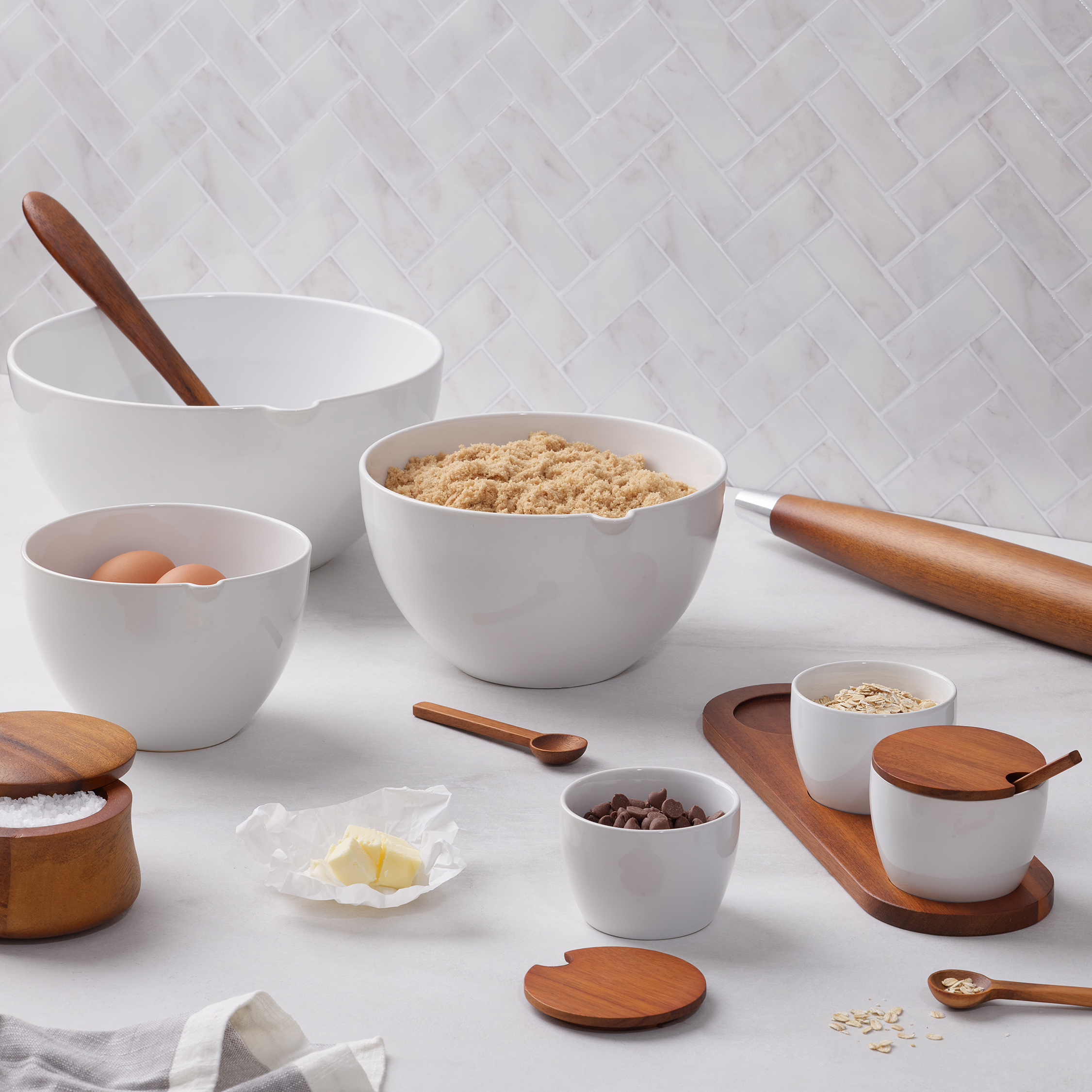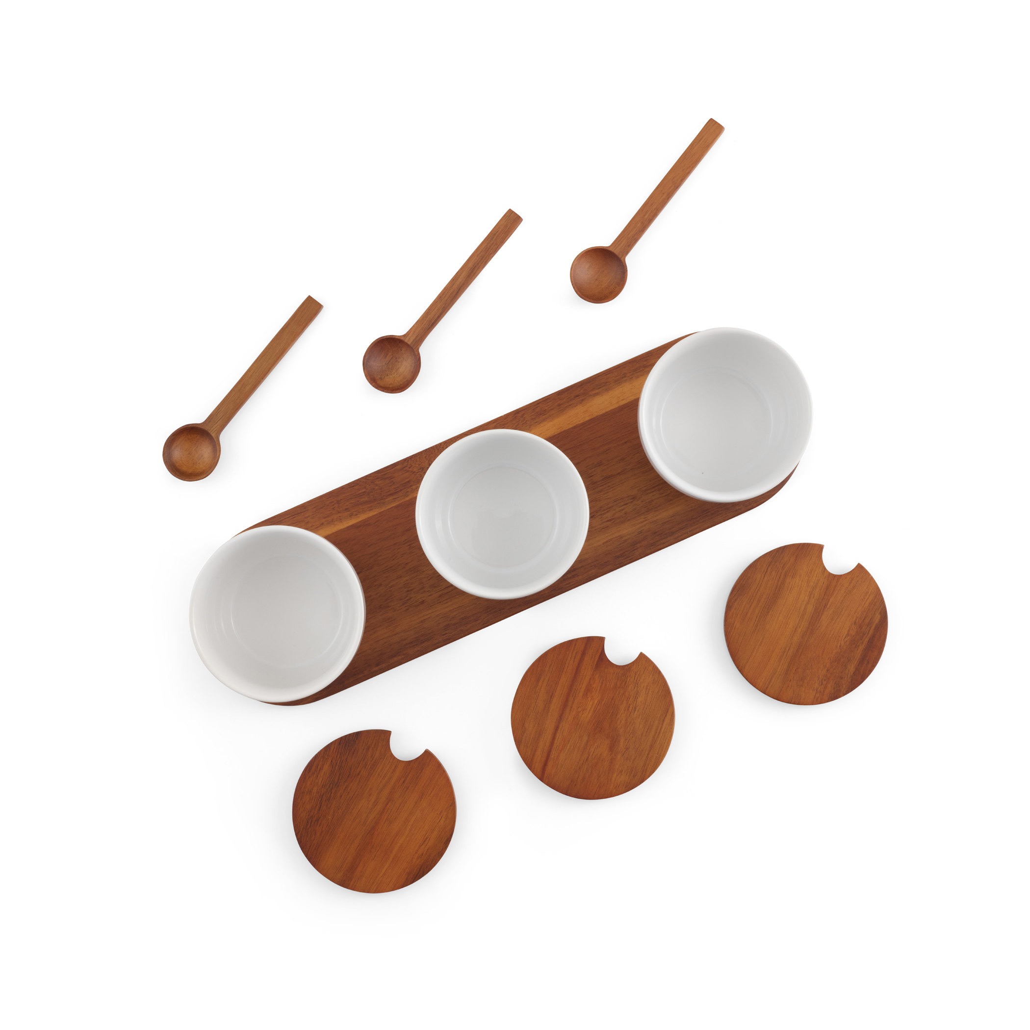 Perfect for serving dipping sauces, nuts, dried fruits, and more. Elegantly showcasing Nambé’s mixed material design, the Duets Triple Condiment Server w/ Lids & Spoons include cool, white porcelain bowls with a warm Acacia wood base, complete with serving spoons and lids.
