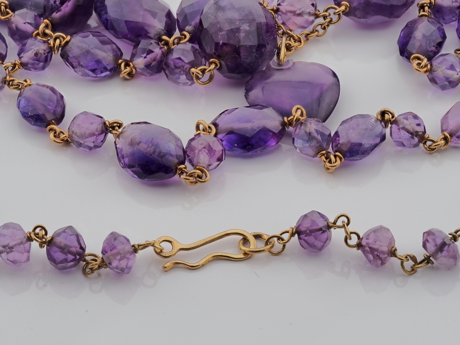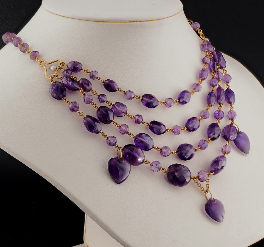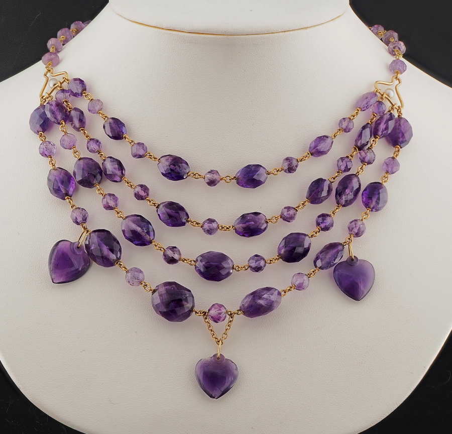 Further Details Below Metal: 18 Kt yellow gold, tested Hallmarks: none/worn Gems: 3 heart (18 x 16 mm.) and 74 natural amethyst briolette beads ranging from (17 x 13 mm. to 7 x 5 mm.) totalling approx 260.00 Ct – 2 salt water pearls of 4 mm. each (average) Measures: central is 11 x 19 cm. (h. x w.) - length is 43.5 Cm Weight: 65.3 grams Condition: very good commensurate to age and use |