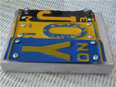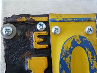 Here is a one-of-a-kind metal wall art made from vintage license plate letters to spell JOY, mounted on sturdy sheet metal. Signed by the artist, looks like R. Bissiou, but not sure. Check out all photos to see construction, distressed signs of license plate age, hanging wire, etc. Measures about 5" x 7.5" x 1". Great for everyday message as well as a classic Christmas message.