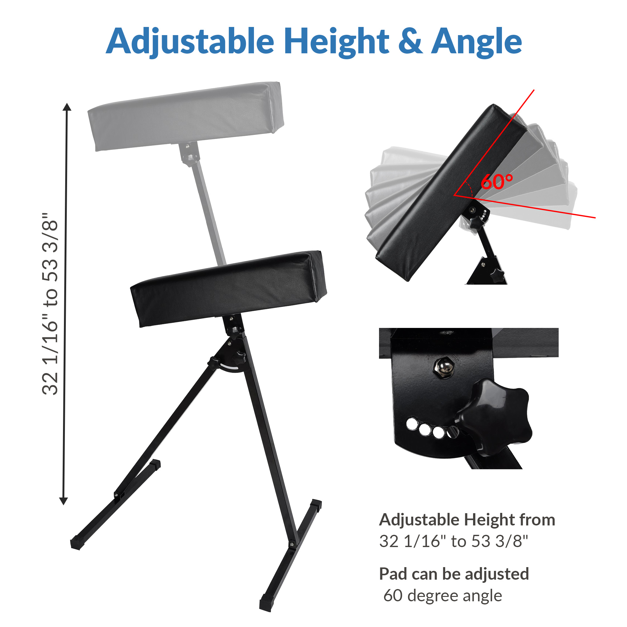 - Adjustable Height & Angle - Stand features adjustable height from 32 1/16" to 53 3/8", and pad can be adjusted 60 degree angle, allowing you to adjust the armrest to meet different tattoo work needs in your comfortable way; Easy to adjust & lock with double clutch locks