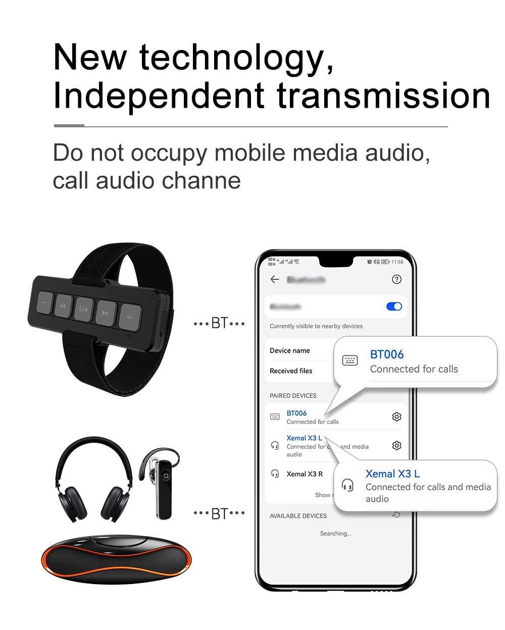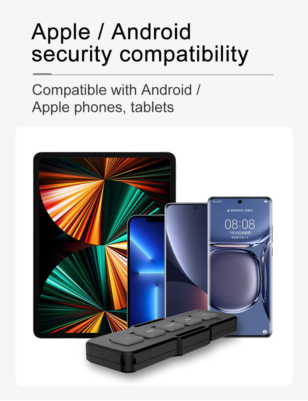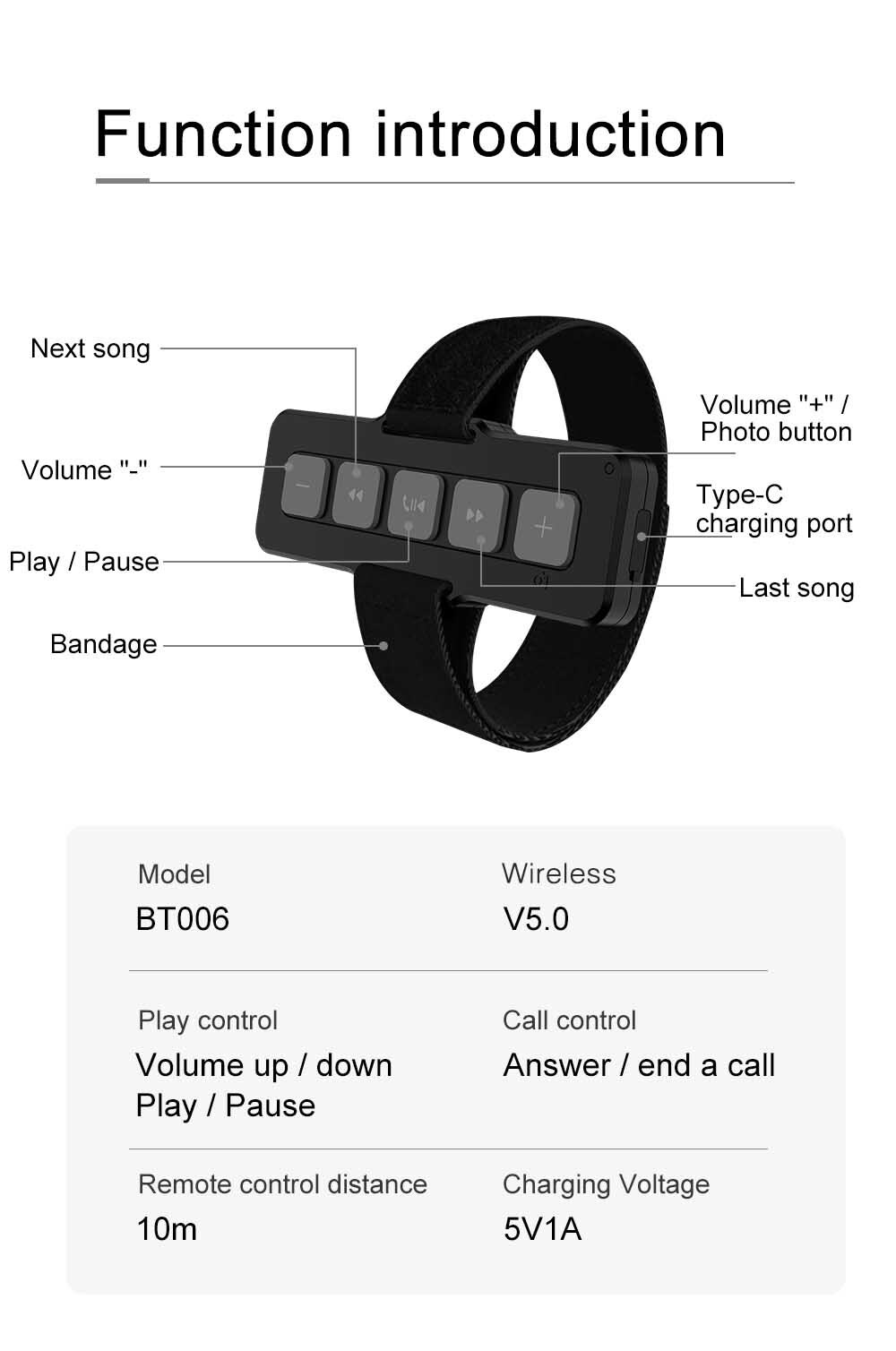Specification: Size:10.7*3.9*1.3cm BT Version: 5.0 Battery capacity: 450mAh Play control: Volume up/down play/ Pause Call Control: Answer/end a call working time: up to 10 days Charging time: less than 2 hours Operation distanc: within 10M Features: 1. Small and exquisite to carry with you 2: Mobile phone control: answer the call, put up the call, play up, down, pause, volume up, volume down. 3: It can be applied to car music control, bicycle music control, motorcycle bicycle control, skiing. 4: The product does not occupy the BT channel. After the mobile phone is paired with the product, it can also be paired with another BT product (such as BT headset, BT audio, car DVD BT), and control the mobile phone to listen to music and answer and put up . voice. 5: IPX4 waterproof level