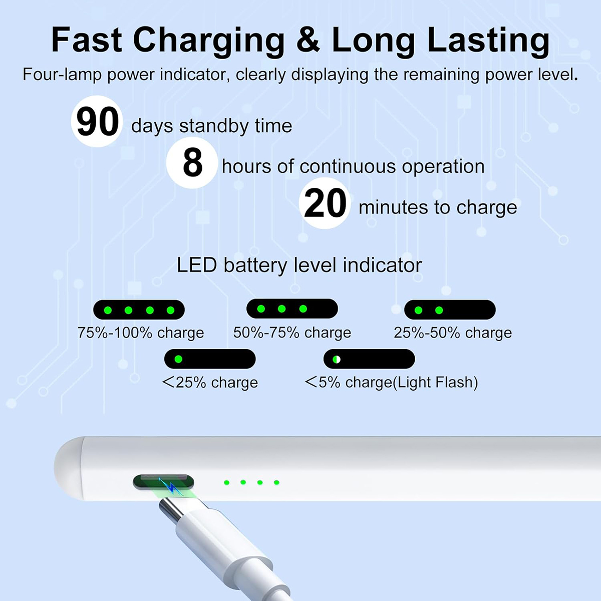 - 【Fast Charging & Power Display】 the iPad pencil 2nd generation With USB-C charging port and built-in battery, just only takes 20 minutes to fully charge and lasts up to 8-hours usage. This for iPad pencil also has four power indicators, each representing 25% power, clearly displaying the remaining power lever and charging progress. This stylus pen will Auto-off and turn in "Sleep Mode" after idle for 30 minutes to save power.