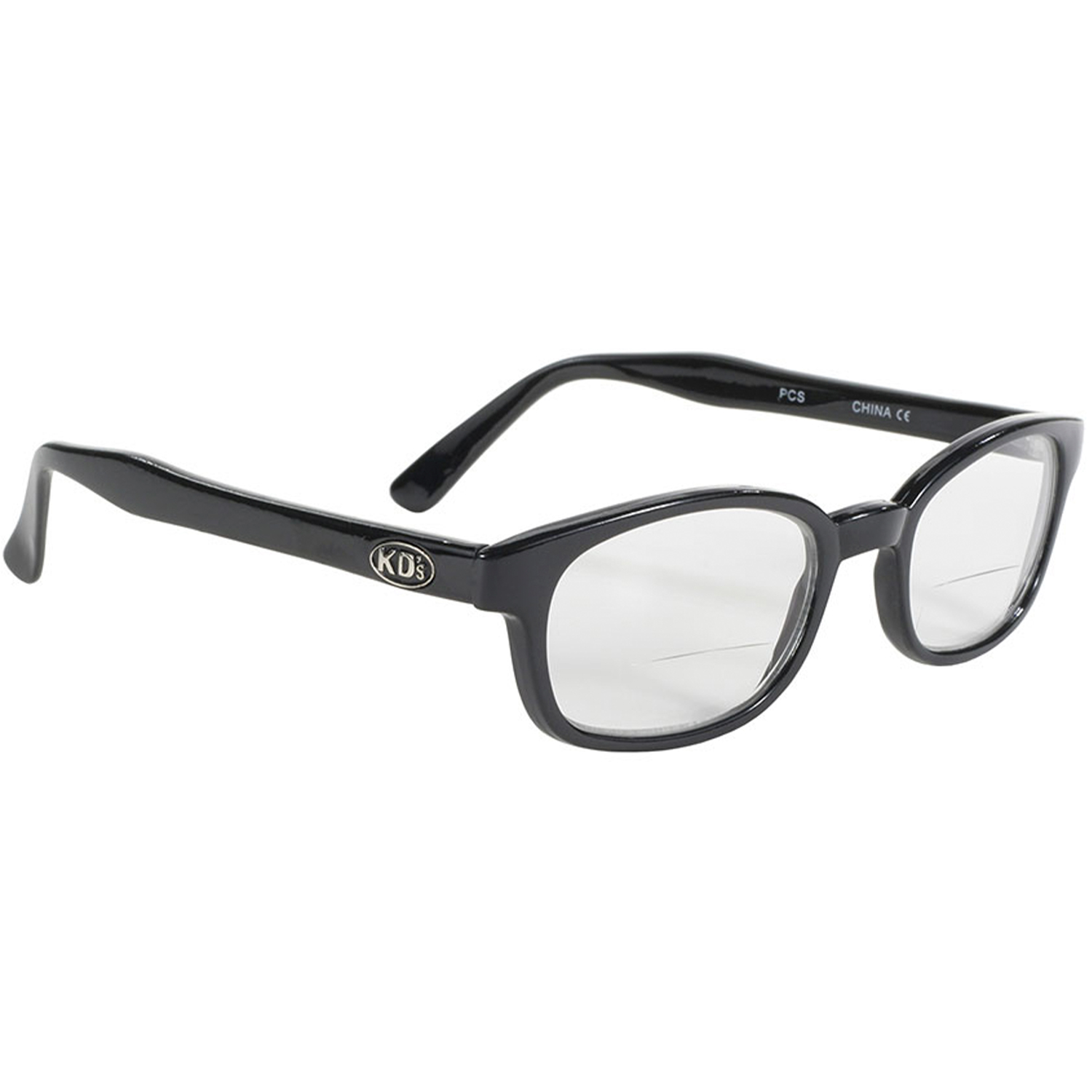Do you need a little help reading the fine print while you're out and about on your bike after dark? Finally you can wear some reading glasses and look cool at the same time! Our X-KDs Bifocal Readerz elevate our Original KDs in two very important ways. These frames are 20% bigger than the original frames *and* provide bifocal magnification at the lower third of the lens, allowing you to read the fine print when you need to without sacrificing your cool look. So whether you've been wearing these glasses for decades or you're more than a little motivated by the Sons of Anarchy, you either know are will soon learn that KD's are so popular because in addition to their cool look, they keep the wind out of your eyes by fitting tightly on the temple and the nose bridge. Made for men and women alike, you're sure to love the style, performance, and fit. KD's fit comfortably under a helmet and feature a sturdy frame with wire-reinforcement at the temple and boast shatterproof polycarbonate impact-resistant UV400 lenses that exceed ANSI Z87.1 standards. Our bifocal readerz are available in clear and smoke lenses with magnification strengths of 1.5, 1.75, 2.0, 2.25, and 2.5. When you purchase this pair, you receive black frames, clear lenses, and a 2.25 bifocal magnification.
