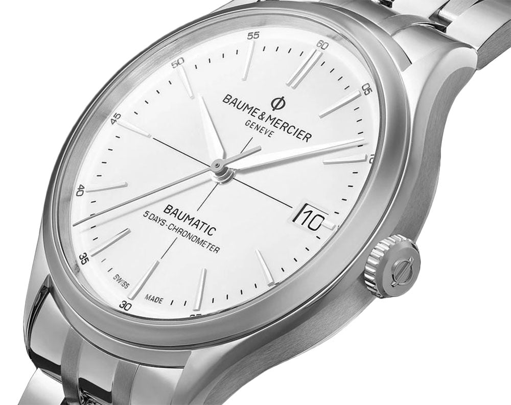 Baume et Mercier Clifton Baumatic COSC Automatic Stainless Steel White Dial Date Mens Watch Model# M0A10505 / MOA10505 epitomizes the modern urban-chic aesthetic. It features a 40 mm stainless steel case with a crisp white crosshair dial, partnered with silver-tone riveted indices and Rhodium-plated alpha-style hands while the secondary minute and seconds indexes are in black. Complementing it further is a scratch-resistant sapphire crystal and the iconic date aperture at the 3 o'clock position. A brushed and polished stainless steel bracelet secured by a triple folding clasp with push-buttons completes the elegant and luxurious look. This watch has a screw-down, see-through caseback showcasing the in-house caliber Baumatic BM13-1975A, a Swiss automatic movement that boasts of a 5-day power reserve, COSC-certified, and is water-resistant up to 50 meters/165 feet.