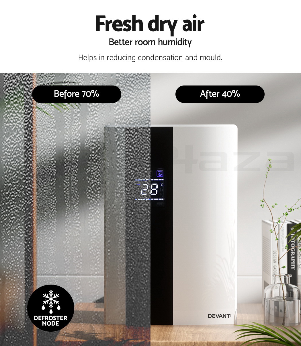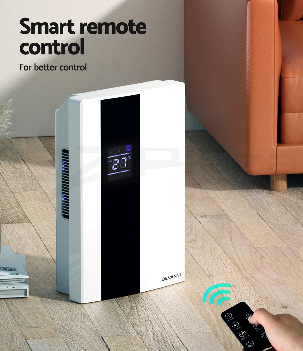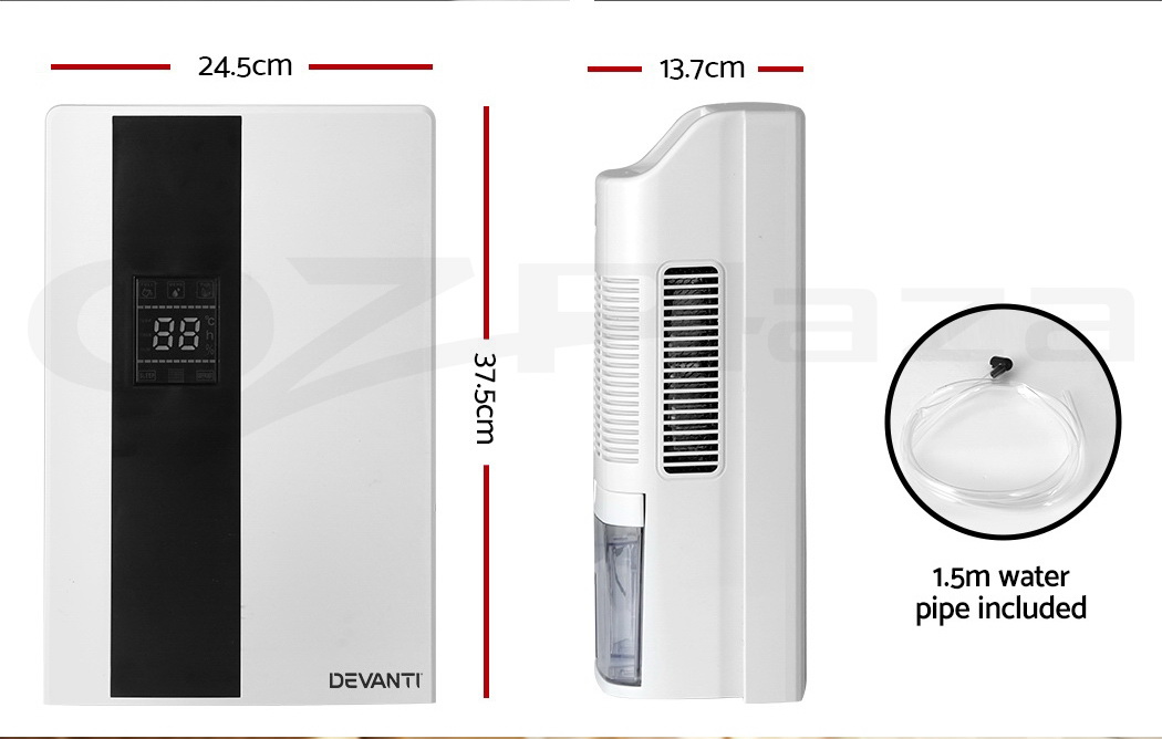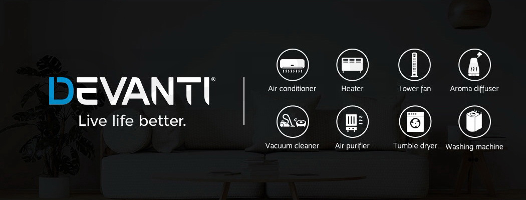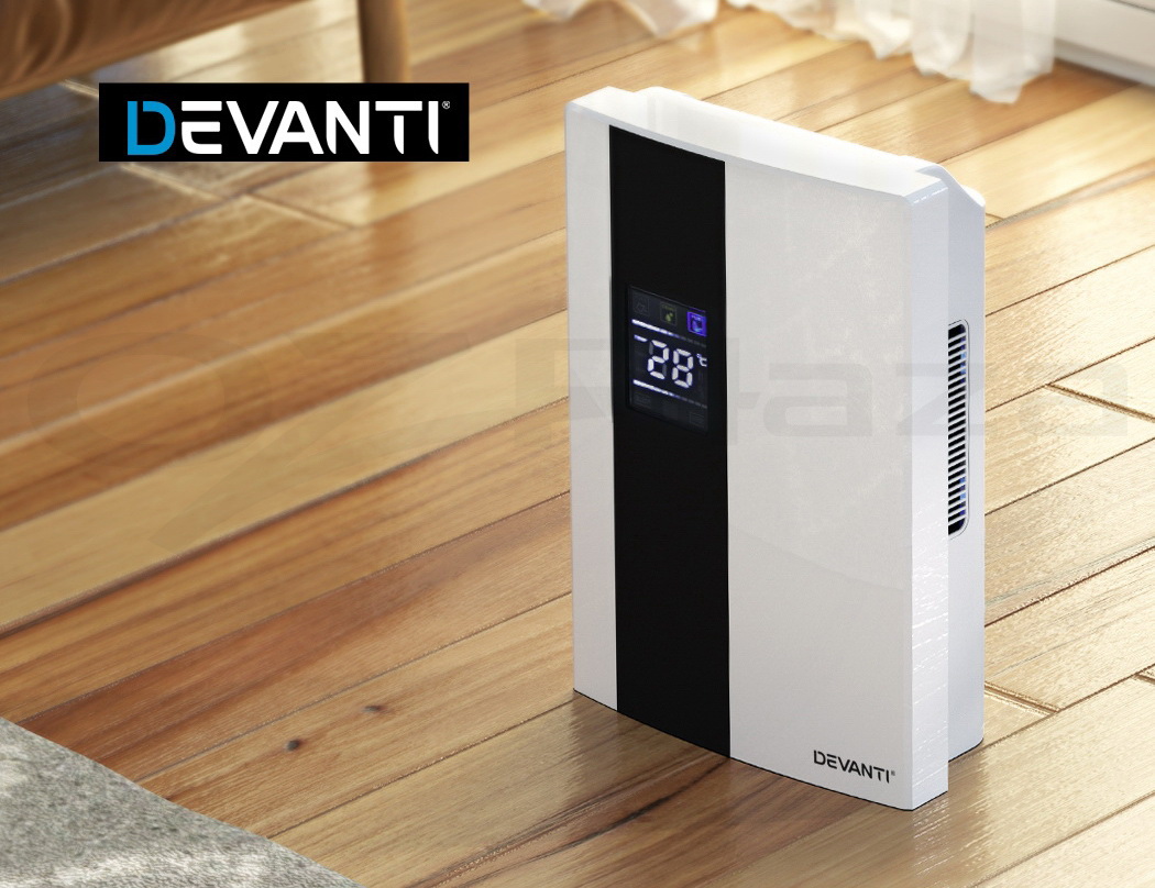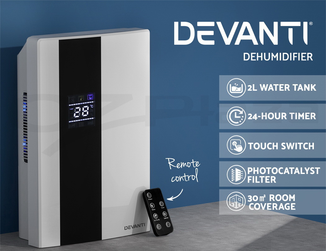 Do you have recurring moisture issues in your home, like mould growth or heavy condensation? Or are you just looking for something to clear the air? Then you need the Devanti Dehumidifier for your home. Many home pests love moist and dark environments, but our dehumidifier will pull water out of the air to reduce damaging moisture in your surroundings, preventing mould, dust mite and mildew growth in your furniture and clothes. Tired of drying clothes indoors? Use the dehumidifier to speed things along – helps to dry clothes faster without using a dryer. The photocatalyst filter removes bacteria and allergens from the air, making the machine a 2-in-1 dehumidifier and air purifier. Control from anywhere inside the home with the included Smart Controller and set timers for up to 24 hours for automatic peace of mind. The dehumidifier operates whisper quiet, so you won’t need to worry about interrupted sleep or household activities. Select from two draining options: The 2L removable water tank with full tank indicator, or continuous drainage with the included 1.5m water pipe. Other great features include an auto-defrost mode for proper machine maintenance, two convenient handles for portability and 30㎡ coverage to suit both small and larger rooms. Turn your home from damp to delightful with a Devanti Dehumidifier.