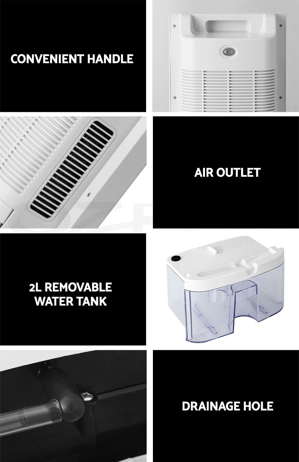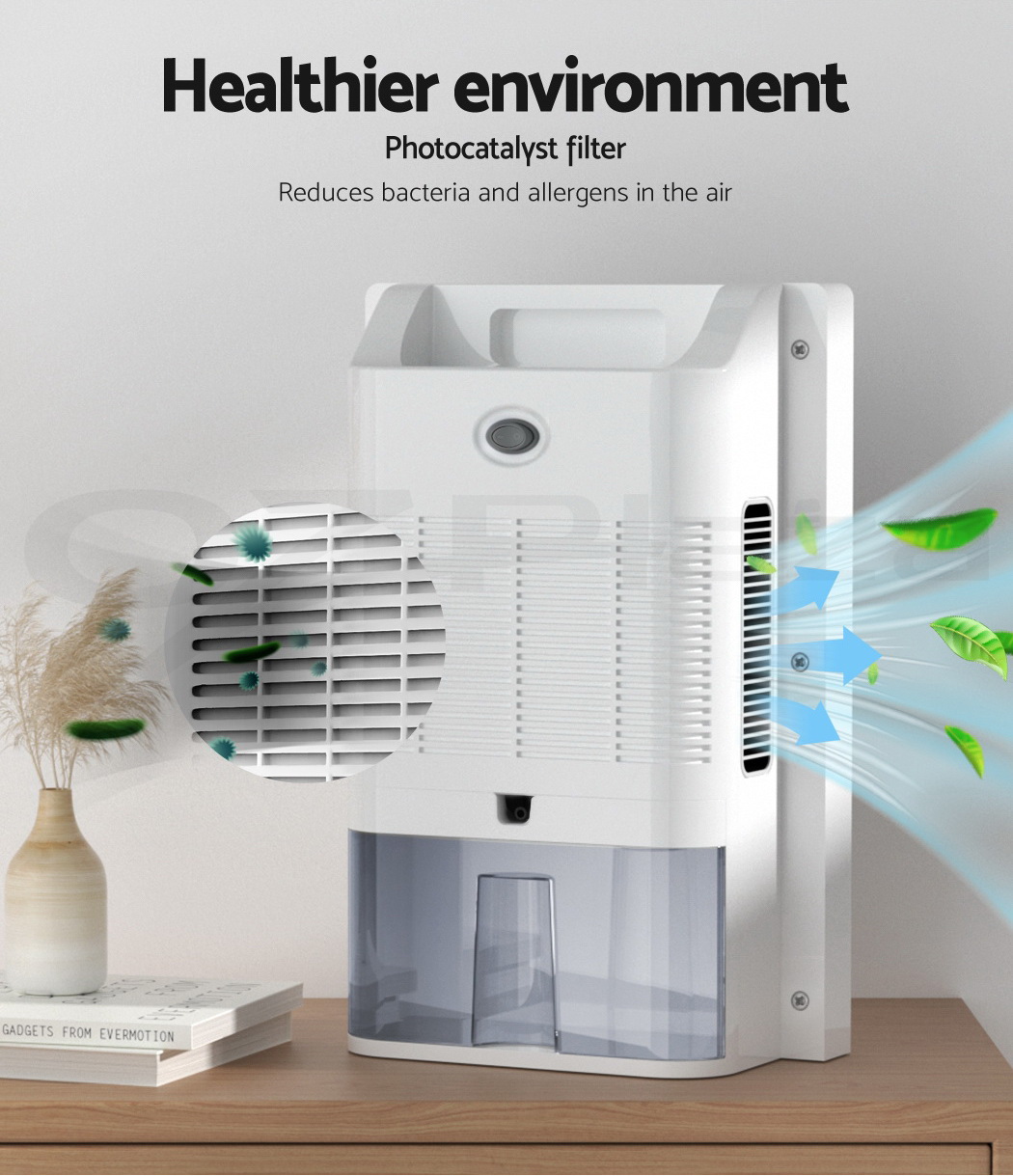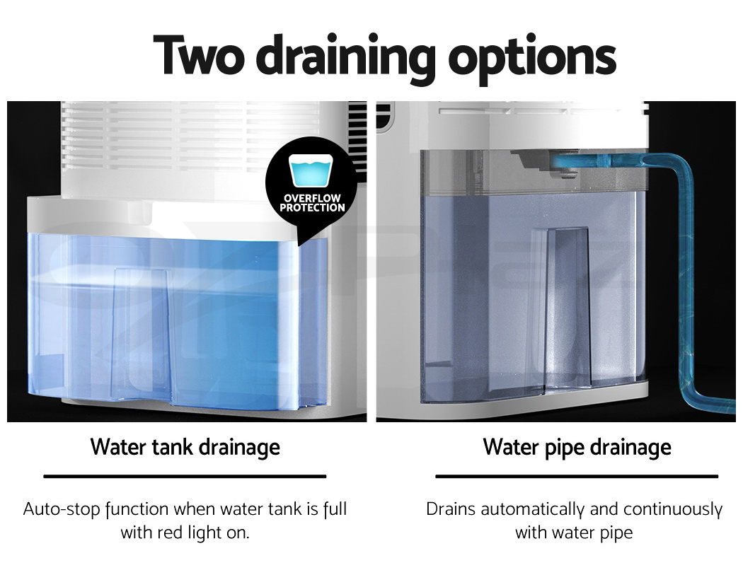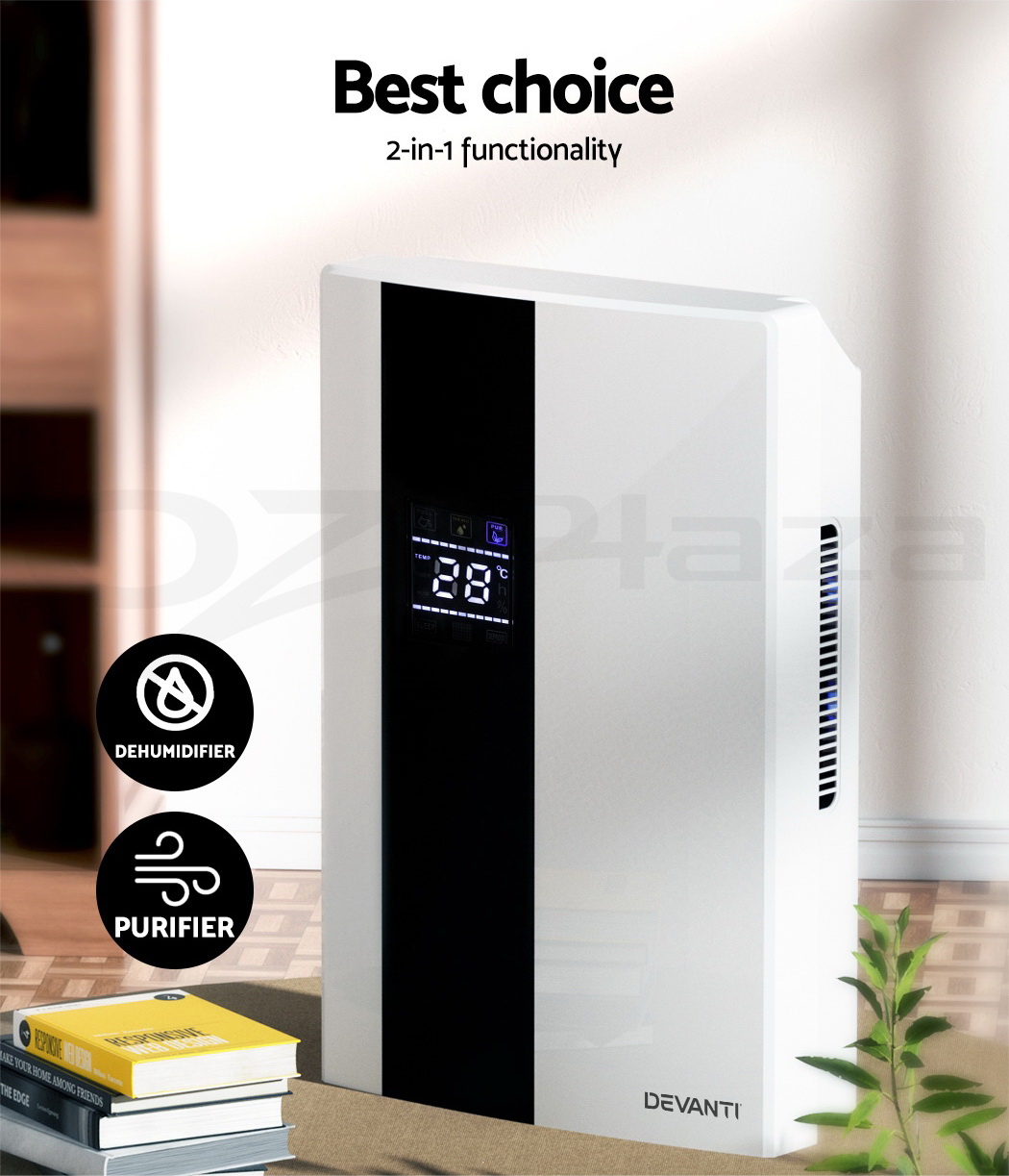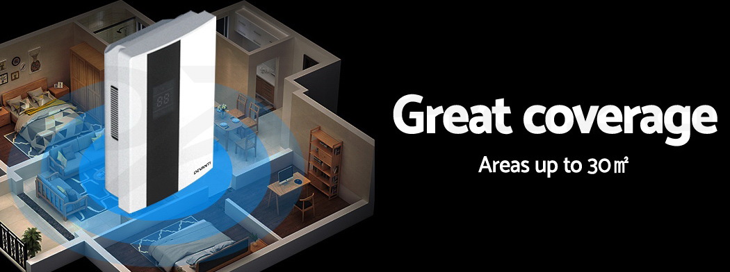 Do you have recurring moisture issues in your home, like mould growth or heavy condensation? Or are you just looking for something to clear the air? Then you need the Devanti Dehumidifier for your home. Many home pests love moist and dark environments, but our dehumidifier will pull water out of the air to reduce damaging moisture in your surroundings, preventing mould, dust mite and mildew growth in your furniture and clothes. Tired of drying clothes indoors? Use the dehumidifier to speed things along – helps to dry clothes faster without using a dryer. The photocatalyst filter removes bacteria and allergens from the air, making the machine a 2-in-1 dehumidifier and air purifier. Control from anywhere inside the home with the included Smart Controller and set timers for up to 24 hours for automatic peace of mind. The dehumidifier operates whisper quiet, so you won’t need to worry about interrupted sleep or household activities. Select from two draining options: The 2L removable water tank with full tank indicator, or continuous drainage with the included 1.5m water pipe. Other great features include an auto-defrost mode for proper machine maintenance, two convenient handles for portability and 30㎡ coverage to suit both small and larger rooms. Turn your home from damp to delightful with a Devanti Dehumidifier.