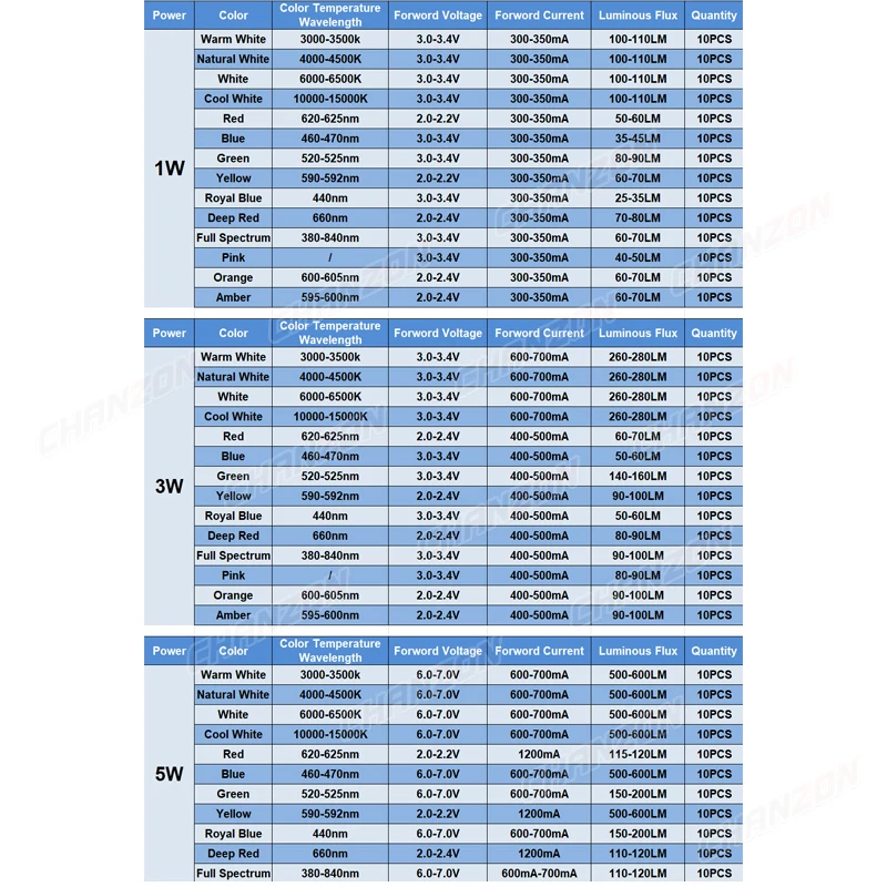 1W 3W 5W Warm Natural Cold White Led Chips Light Bulb High Power Intensity Red Blue Green Yellow Full Spectrum Grow Light Lamp