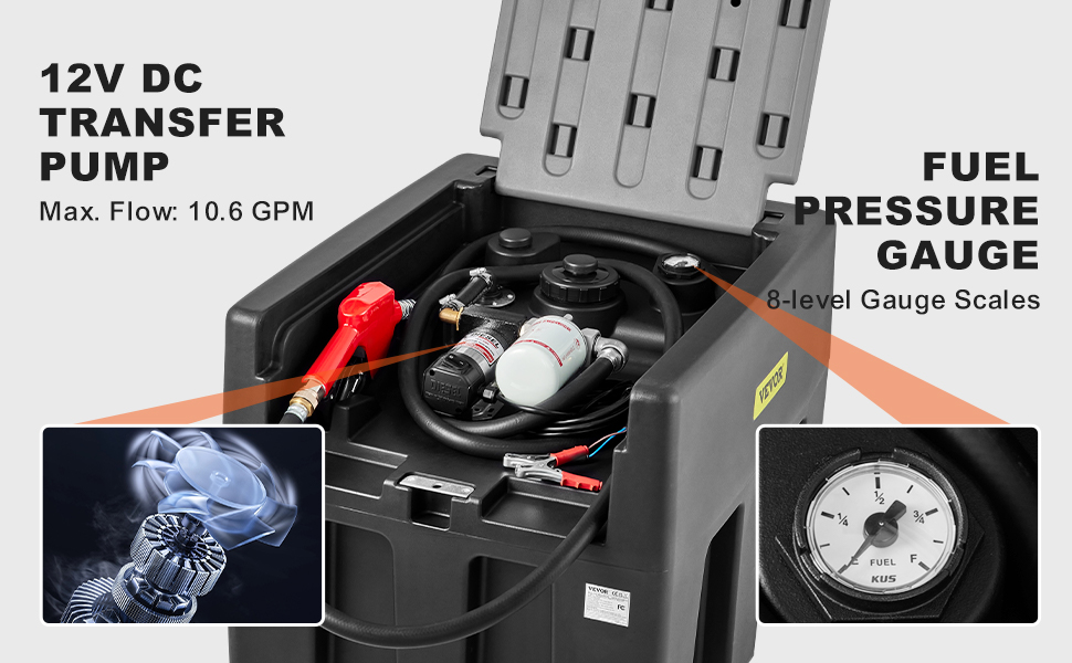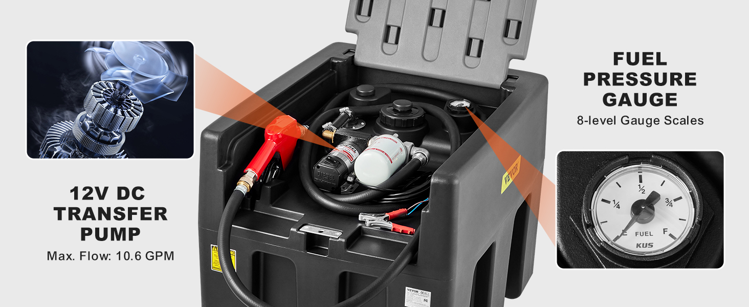 58 Gallon Efficient Refueling: Flow Rate: 10.6 GPM; Output Power: 140W. The 12V transfer pump provides strong power to deliver fuel from the diesel fuel tank to your vehicles with high efficiency. We adopt a mechanical fuel gauge aimed to monitor the capacity of diesel in time, reminding you to fill up in time.