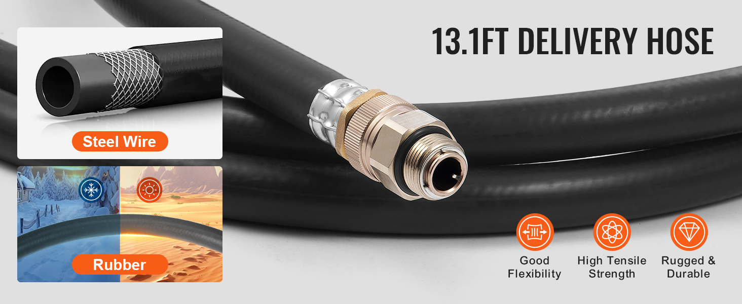 Our portable fuel tank's delivery hose is composed of a rubber hose and inlaid with steel wire. The characteristics of high support and excellent flexibility make it not easy to soften and break. Ensuring the oil can be conveyed smoothly and efficiently.
