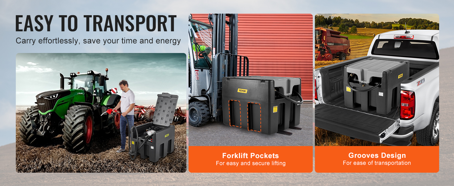 Comes with 2 grooves and forklift pockets for easy and safe movement of the diesel tank. The integrated forklift pocket design moves when the tank is full, and convenient grooves for easy lifting.