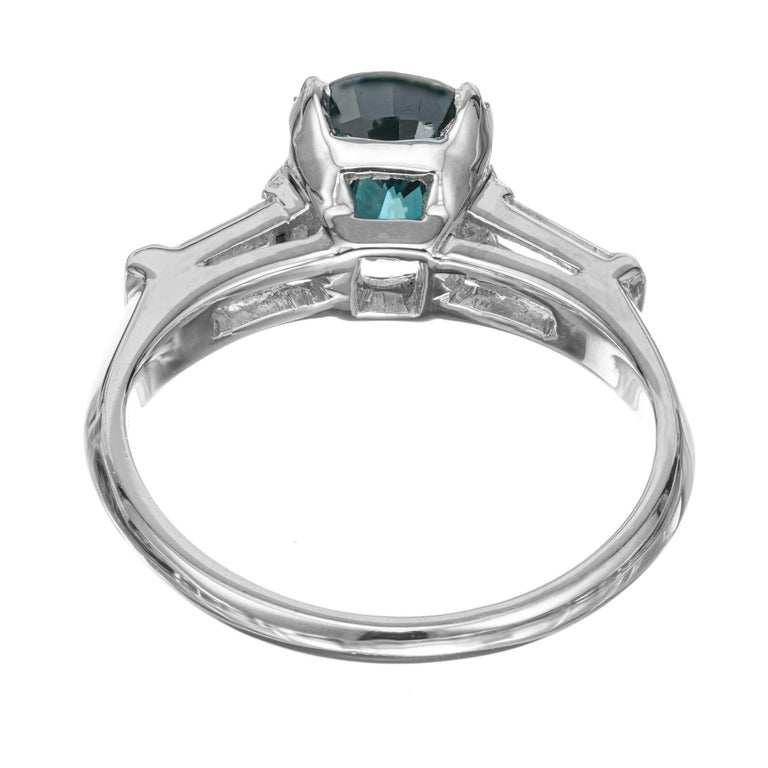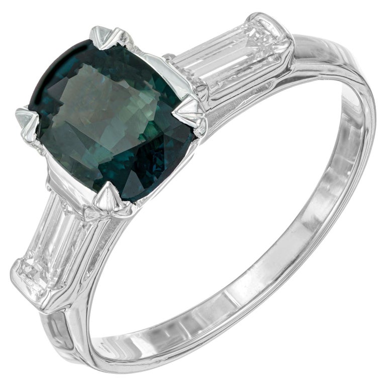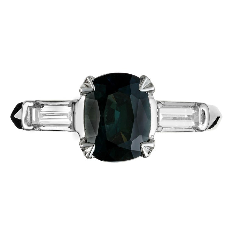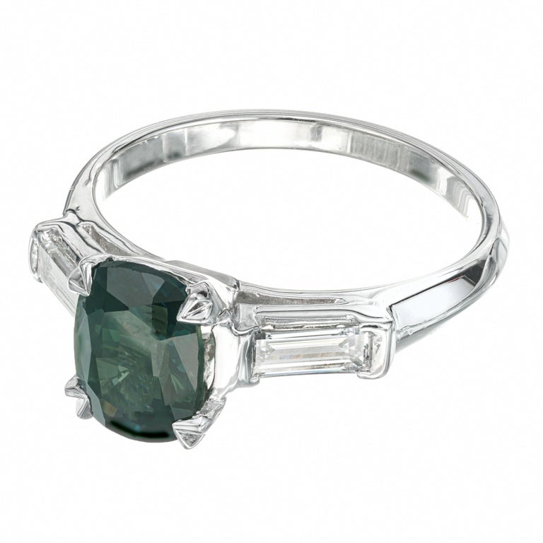 Natural green sapphire and diamond engagement ring. GIA Certified natural untreated oval cushion cut sapphire in a platinum three-stone setting with two baguette cut side diamonds. from an estate circa 1920. The setting is designed and crafted in the Peter Suchy workshop. The sapphire is from a 1920's estate.