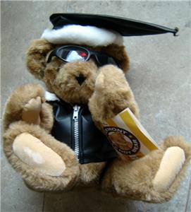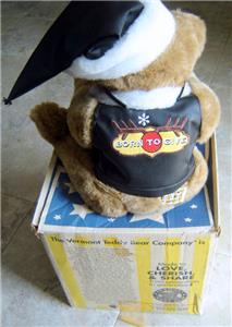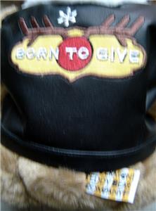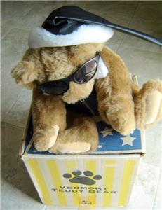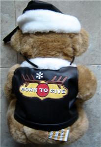 ITEM: Vermont Teddy BEAR in Leather Jacket Hat and Sunglasses with original box. BORN TO GIVE logo patch on the back of the jacket. Paper tag story of the Vermont Teddy Bear booklet attached. Measures 10" tall by 9" wide by 9" deep. CONDITION: Bear is in good condition. Box has some wear. TERMS: Winning bidder adds $14.00 s/h. |