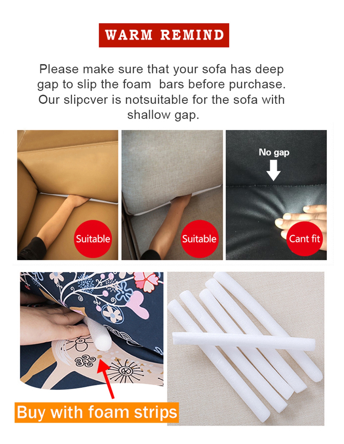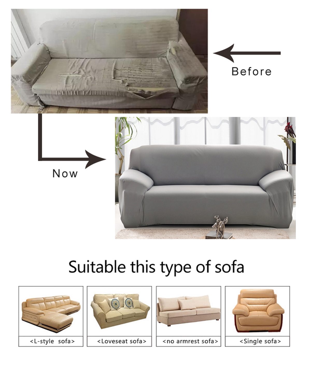 With stretch material, It suits for most types sofa, like fabric sofa, or leather sofa with gap.
