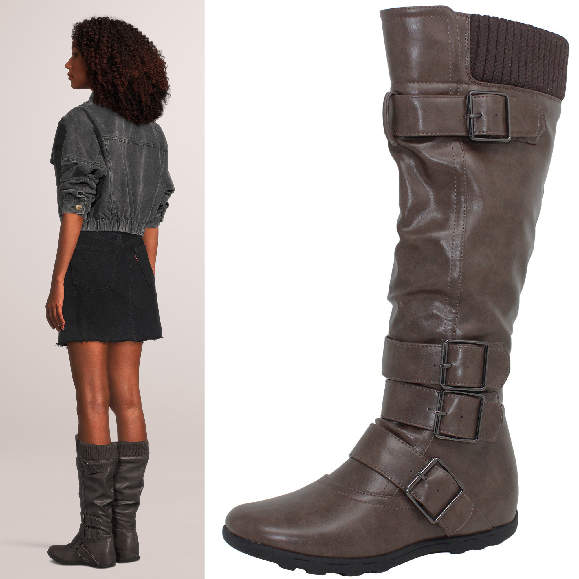 Crafted from soft, man-made leather, this knee-high boot will put some "oomph" in your everyday casual style. Vintage strappy buckles wrap around the ankle and shaft, adding an edgy vibe, while a cushioned insole provides comfort and support with every step. - **PLEASE NOTE THAT THIS STYLE RUNS 1/2 SIZE BIGGER**