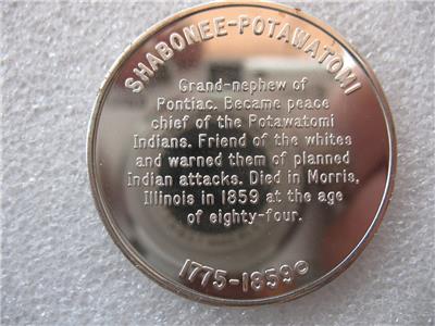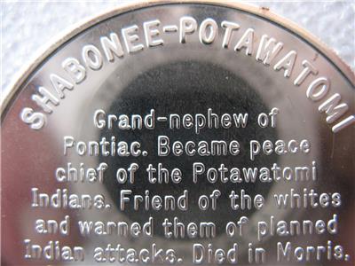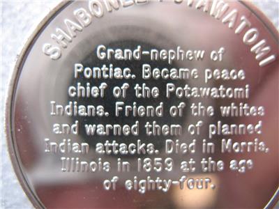 You are bidding on 1 OZ STERLING SILVER Art round (SHABONEE POTAWATOMI) This is the coin you will receive and is in GREAT condition. It is really beautiful in its detail. Besides being a great collectors item, pure Silver is up in the last 10 years and art rounds are bringing a premium over the spot price of silver from investors and collectors. This is a fun way to invest in silver and have a beautiful coin to boot. Great gift or add to a collection.