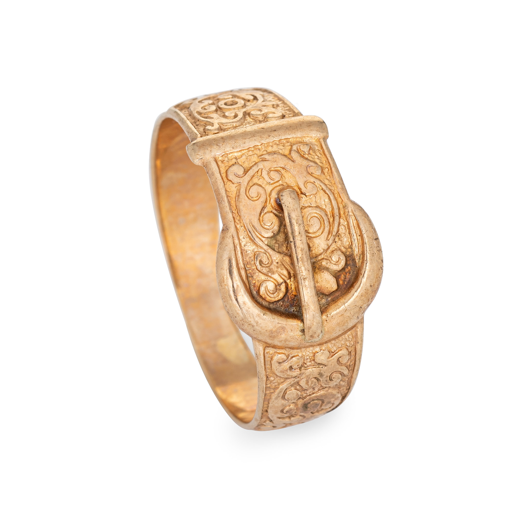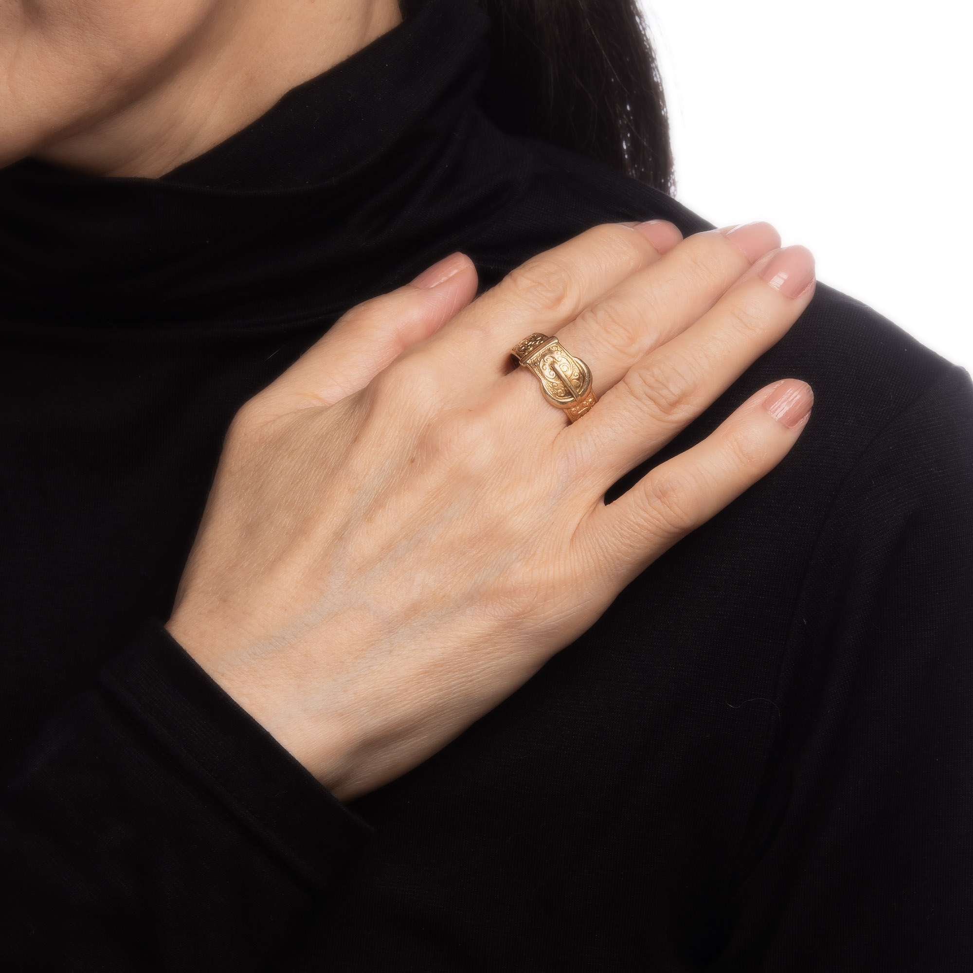 The stylish buckle ring features a charming scrolled design. Currently a size 10 1/2 (can be resized) the ring is great worn alone or stacked with your fine jewelry from any era. The buckle motif represents the joining of two lives together. The wide band (11mm - 0.43 inches) sits comfortably on the finger.