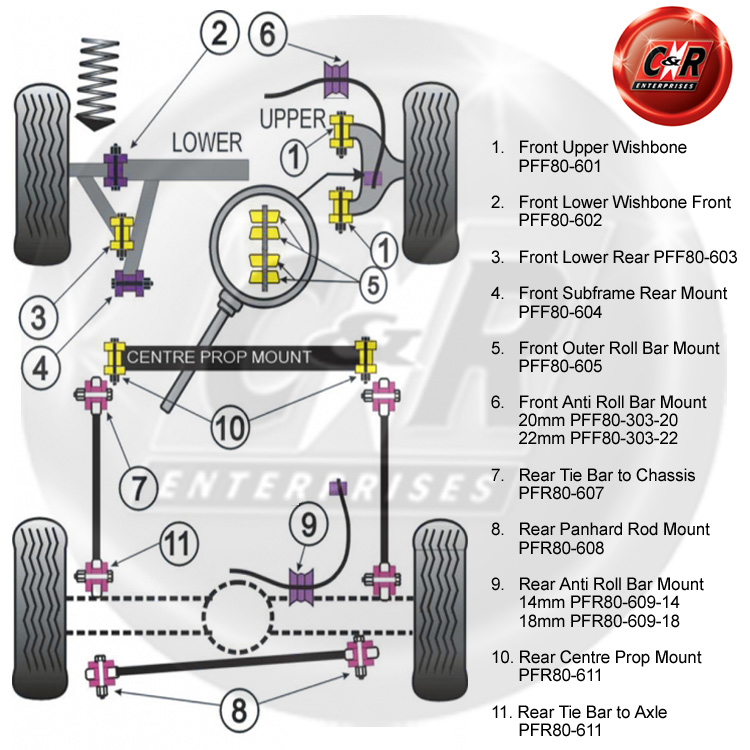 For help identifying the location of the bushes in this kit on your vehicle, please refer to the diagram below.